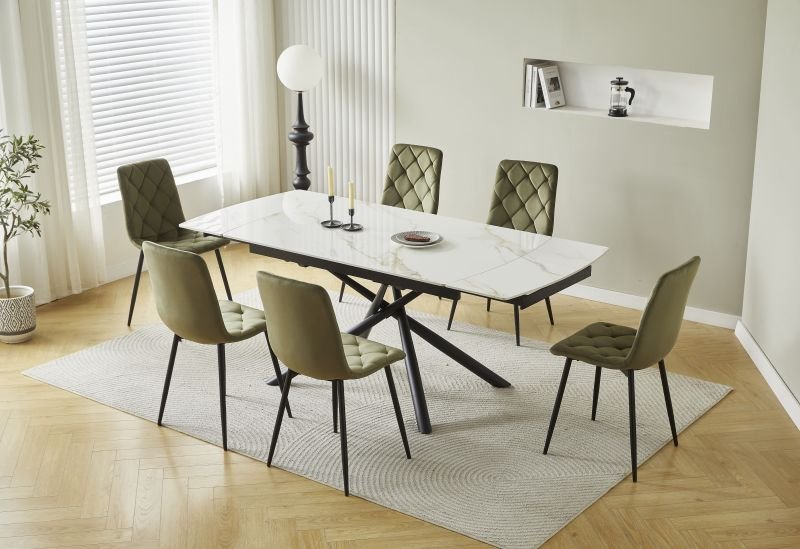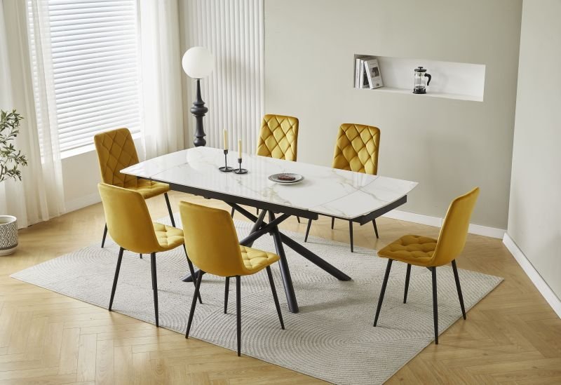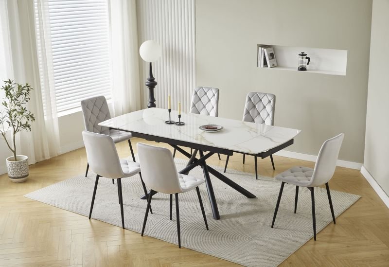 • Die Tischplatte besteht aus hochwertiger Keramik mit einem Marmordesign und ist 11 mm stark.