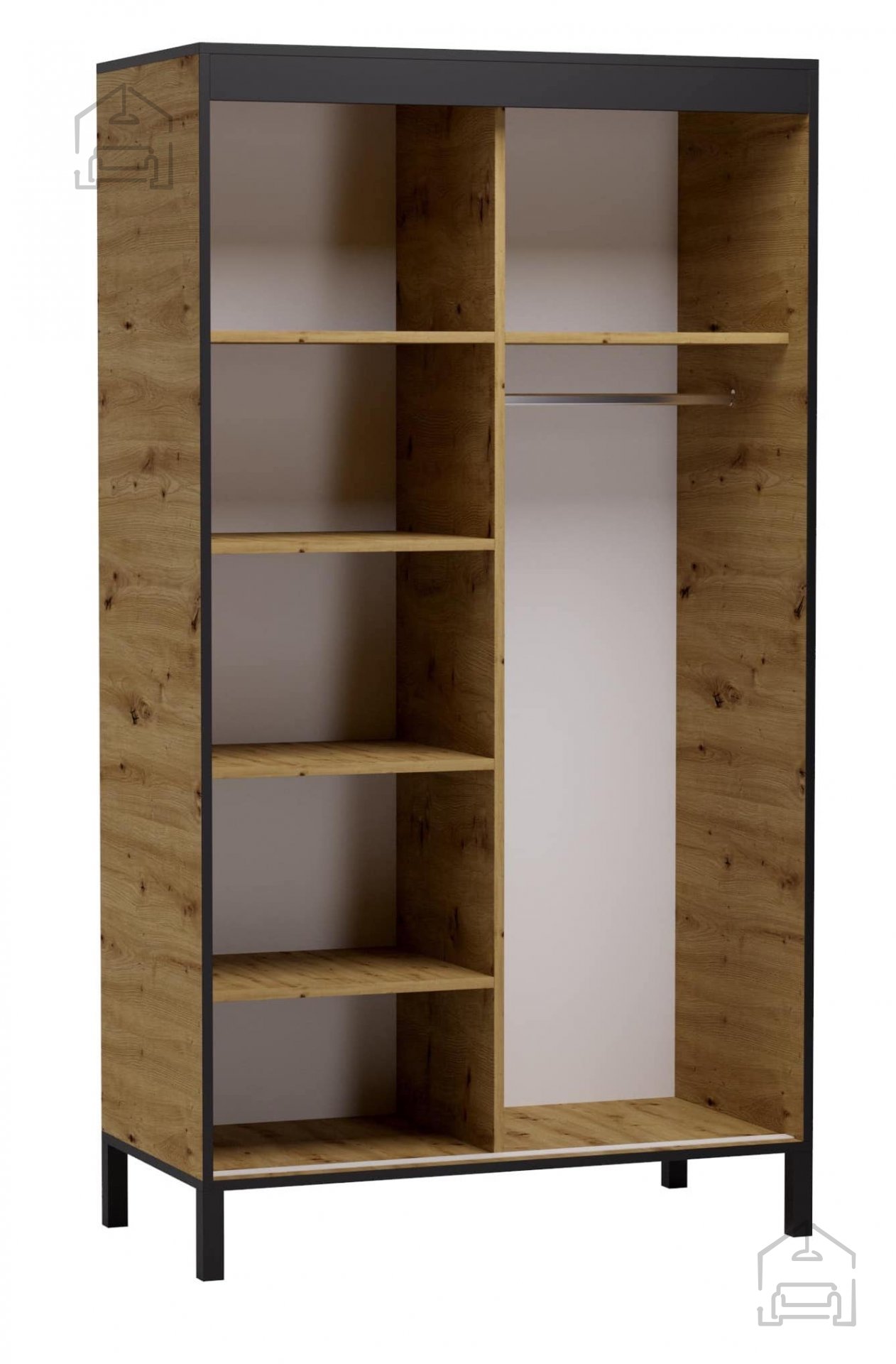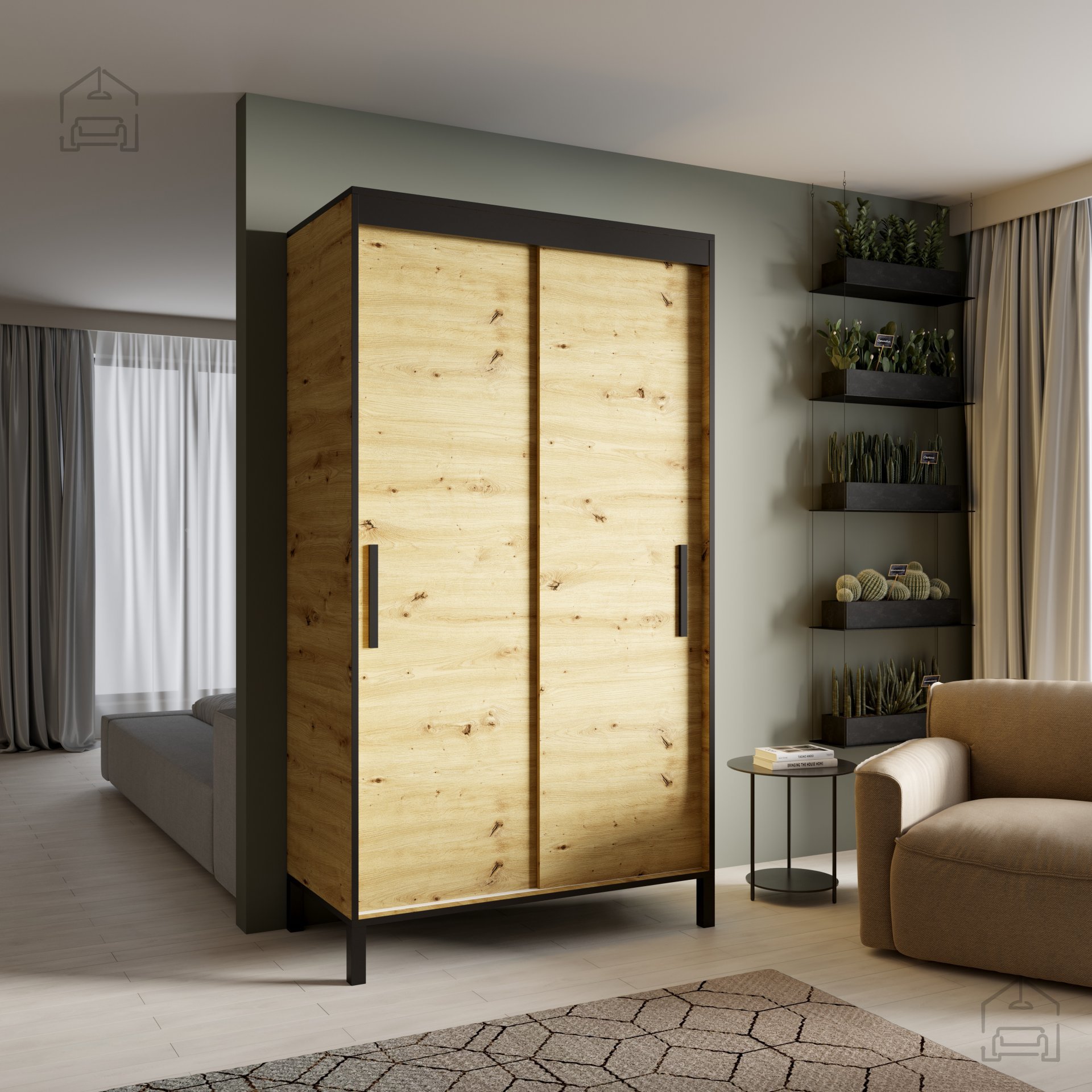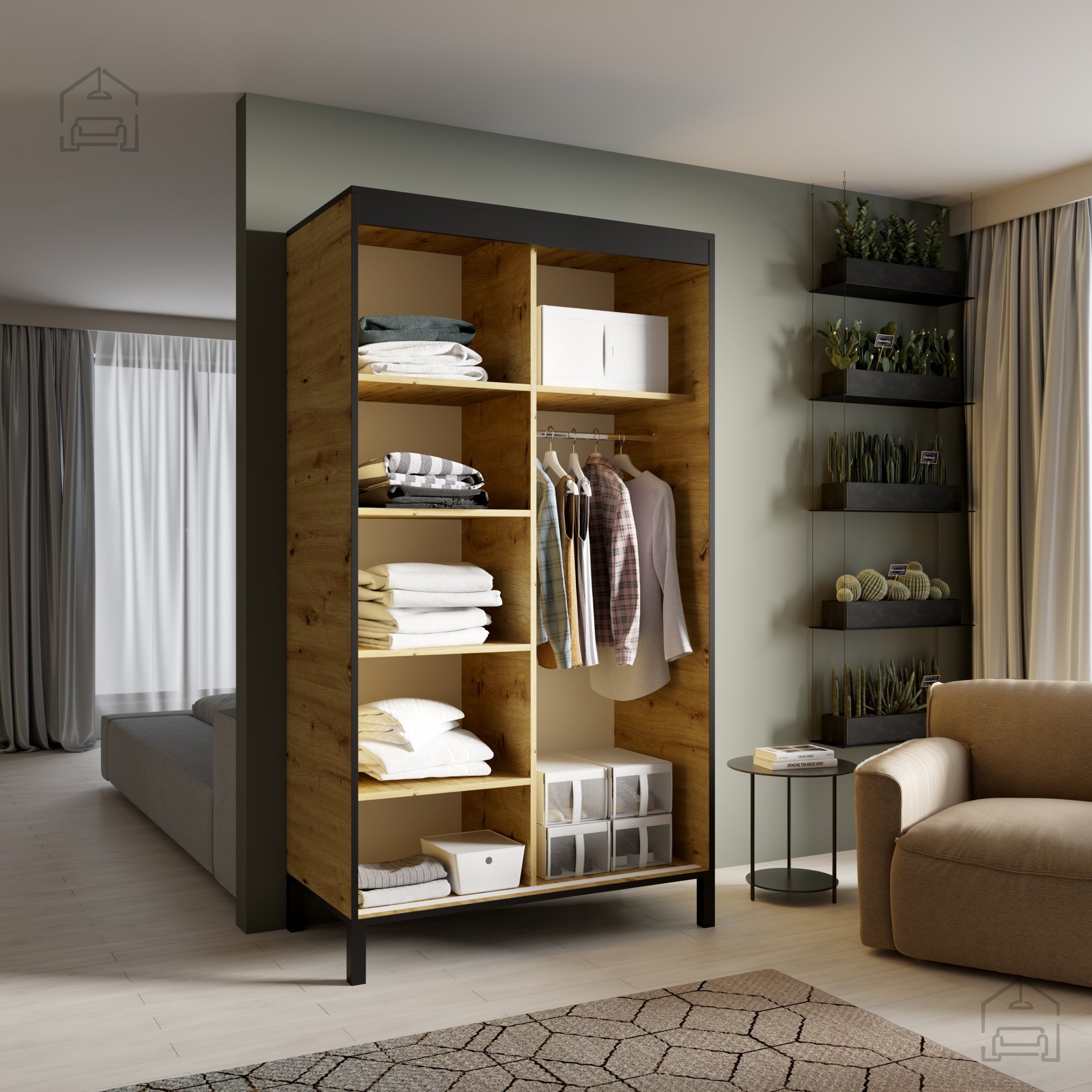 Gefertigt aus robustem Spanplattenmaterial überzeugt der Kleiderschrank durch Langlebigkeit und einfache Pflege. Er ist in zwei attraktiven Farbkombinationen erhältlich – Artisan/Schwarz sowie Weiß/Schwarz – und lässt sich dadurch problemlos mit verschiedenen Einrichtungsstilen kombinieren. Schwarze Metallgriffe und stabile schwarze Füße verleihen dem Möbelstück einen modernen Touch und sorgen dafür, dass der Schrank nicht nur praktisch, sondern auch optisch ansprechend ist.