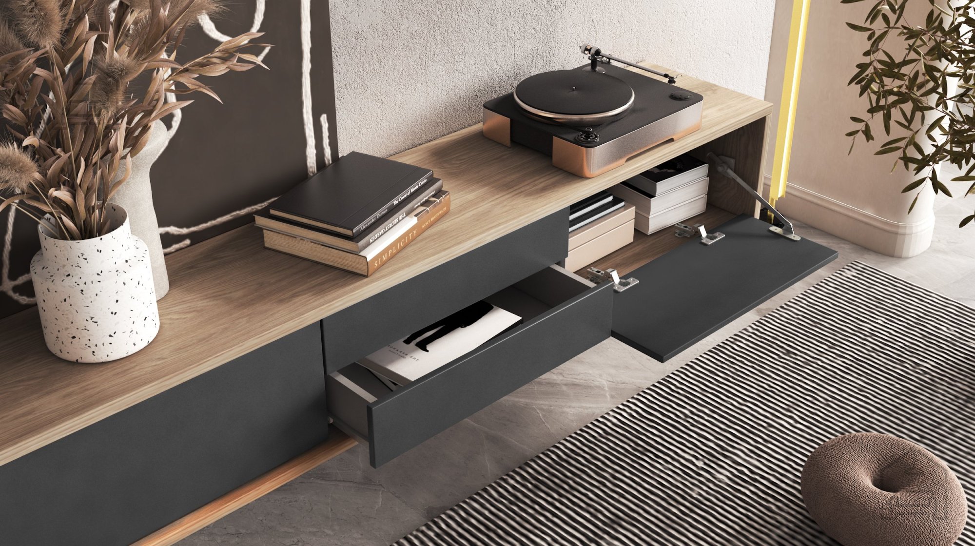 Die TV-Kommode Frida 2K2S besteht aus einer laminierten Spanplatte, die für Langlebigkeit und Widerstandsfähigkeit im Alltag sorgt. Die Oberfläche in geölter Eiche verleiht Wärme und einen natürlichen Look, während die anthrazitfarbenen Akzente einen modernen, eleganten Kontrast schaffen. Diese Kombination aus Materialien und Farben ergibt ein harmonisches Gesamtbild, das sich mühelos in verschiedene Einrichtungsstile einfügt.