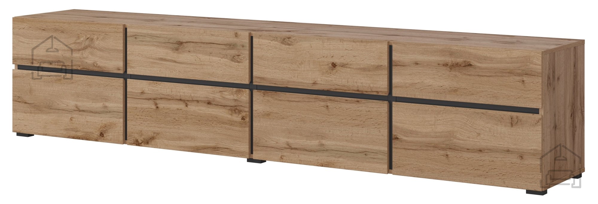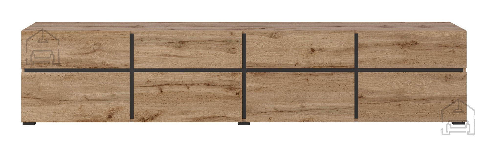 Die TV-Kommode Cross - 24N6MY40 mit den Maßen 225x40x48 cm bietet großzügigen Platz für all Ihre Multimediageräte – vom Fernseher über Spielkonsolen bis hin zu Lautsprechern und vielem mehr. Mit ihrem eleganten Erscheinungsbild und der Farbkombination Eiche Wotan/Wotan-Schwarz fügt sie sich nicht nur harmonisch in Ihr Zuhause ein, sondern verleiht dem Raum auch eine stilvolle Note. Der warme Ton der Eiche sorgt für Gemütlichkeit, während die schwarzen Elemente einen modernen Akzent setzen.