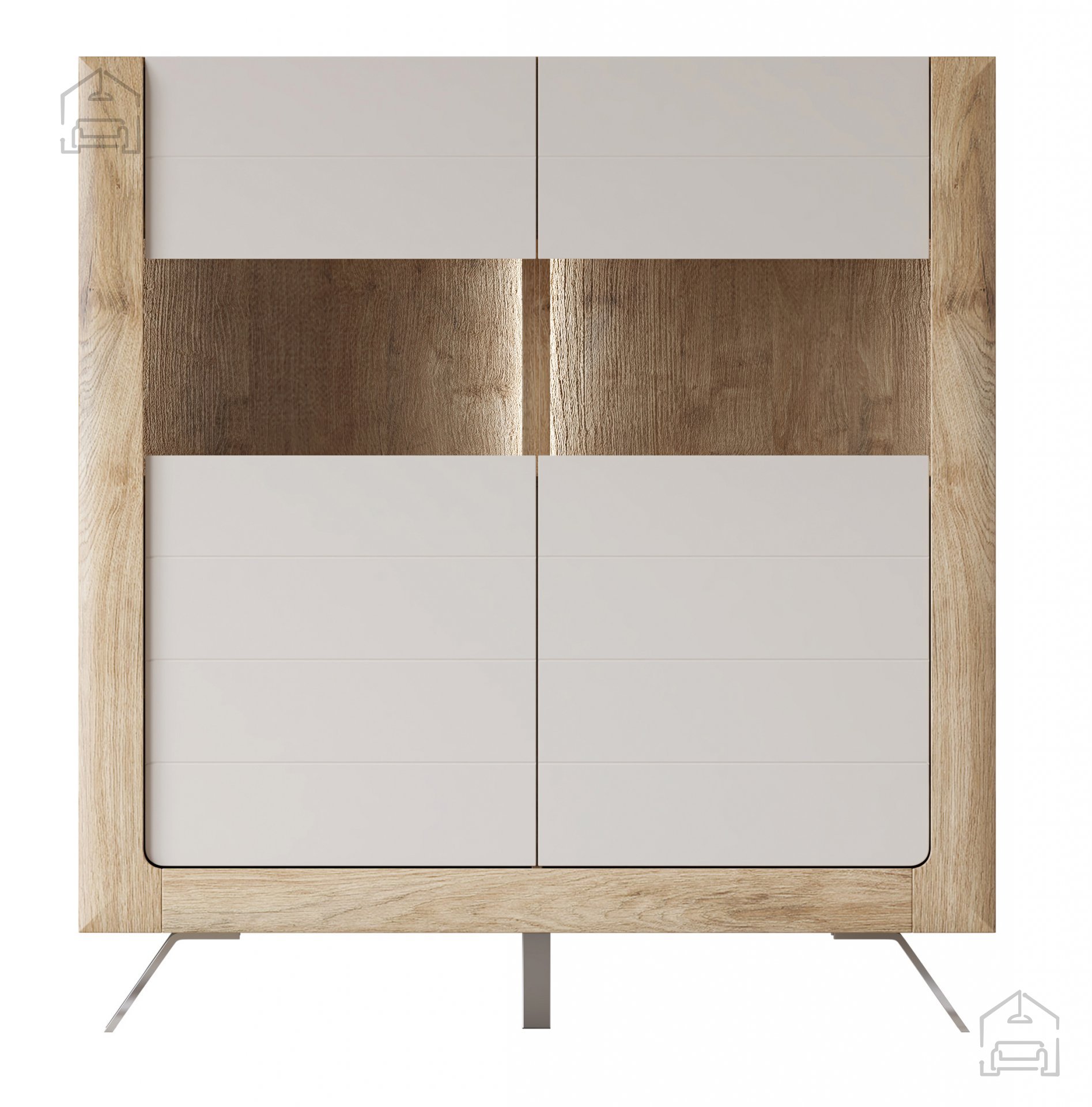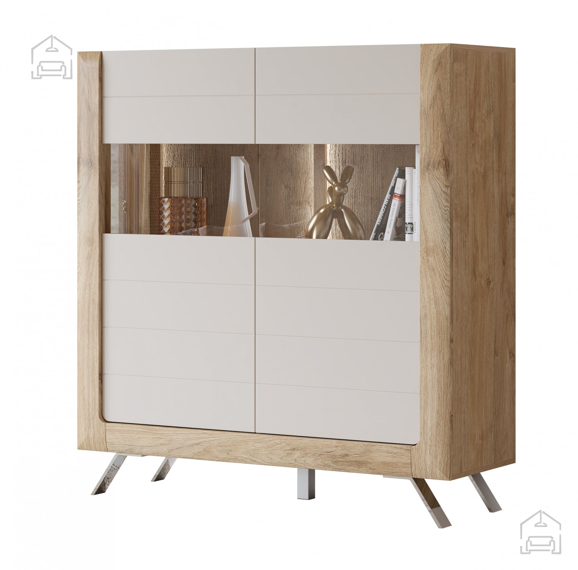 Die zweifarbige Kombination aus Gold Harbor Eiche und Perfect Touch Cashmere verleiht der Vitrine Kasai eine warme und einladende Ausstrahlung. Diese elegante Farbgestaltung lässt sich mühelos mit verschiedensten Einrichtungsstilen kombinieren – ob modern oder klassisch. Der Cashmere-Ton bringt einen dezenten, edlen Akzent, der sich harmonisch in Ihr bestehendes Interieur einfügt.