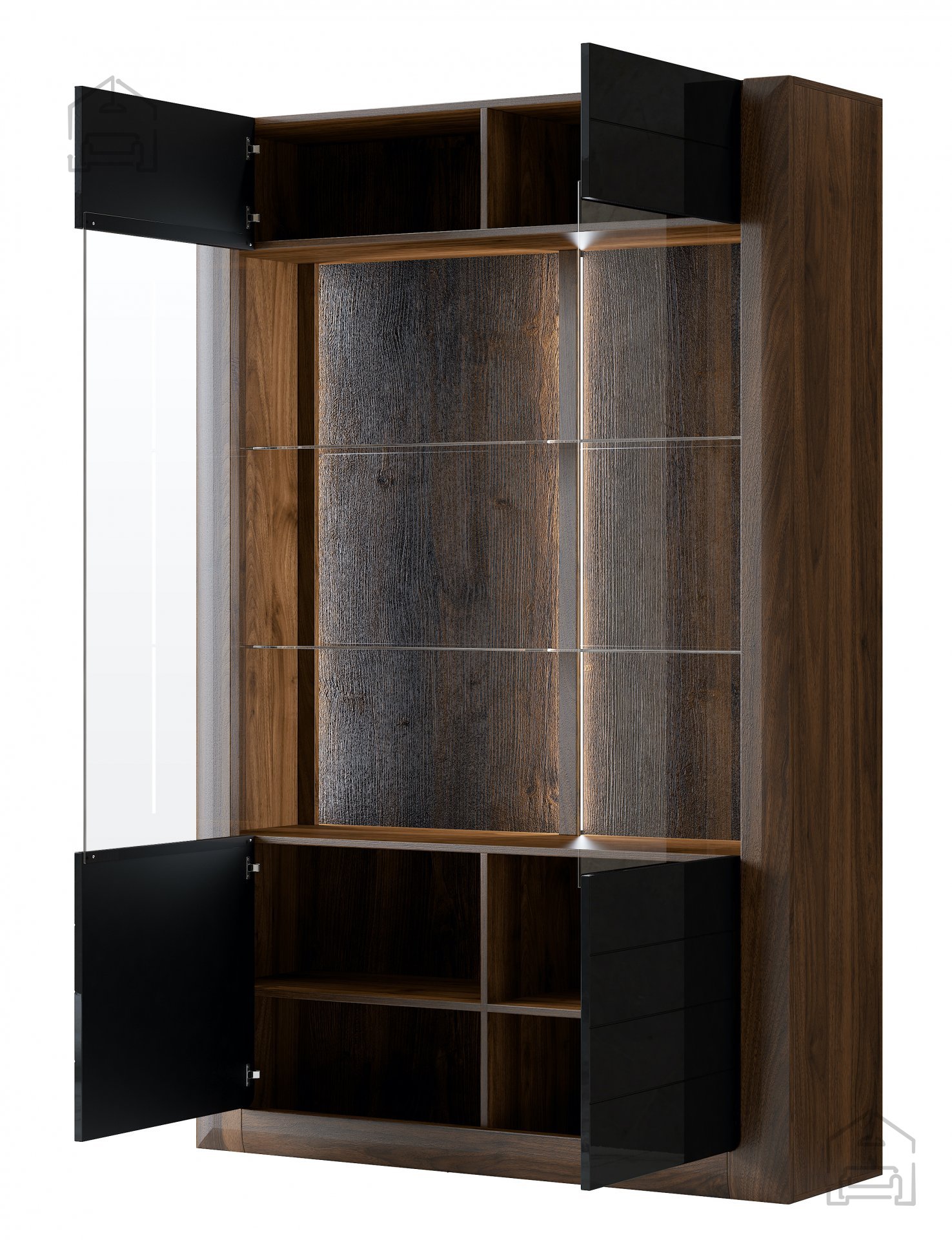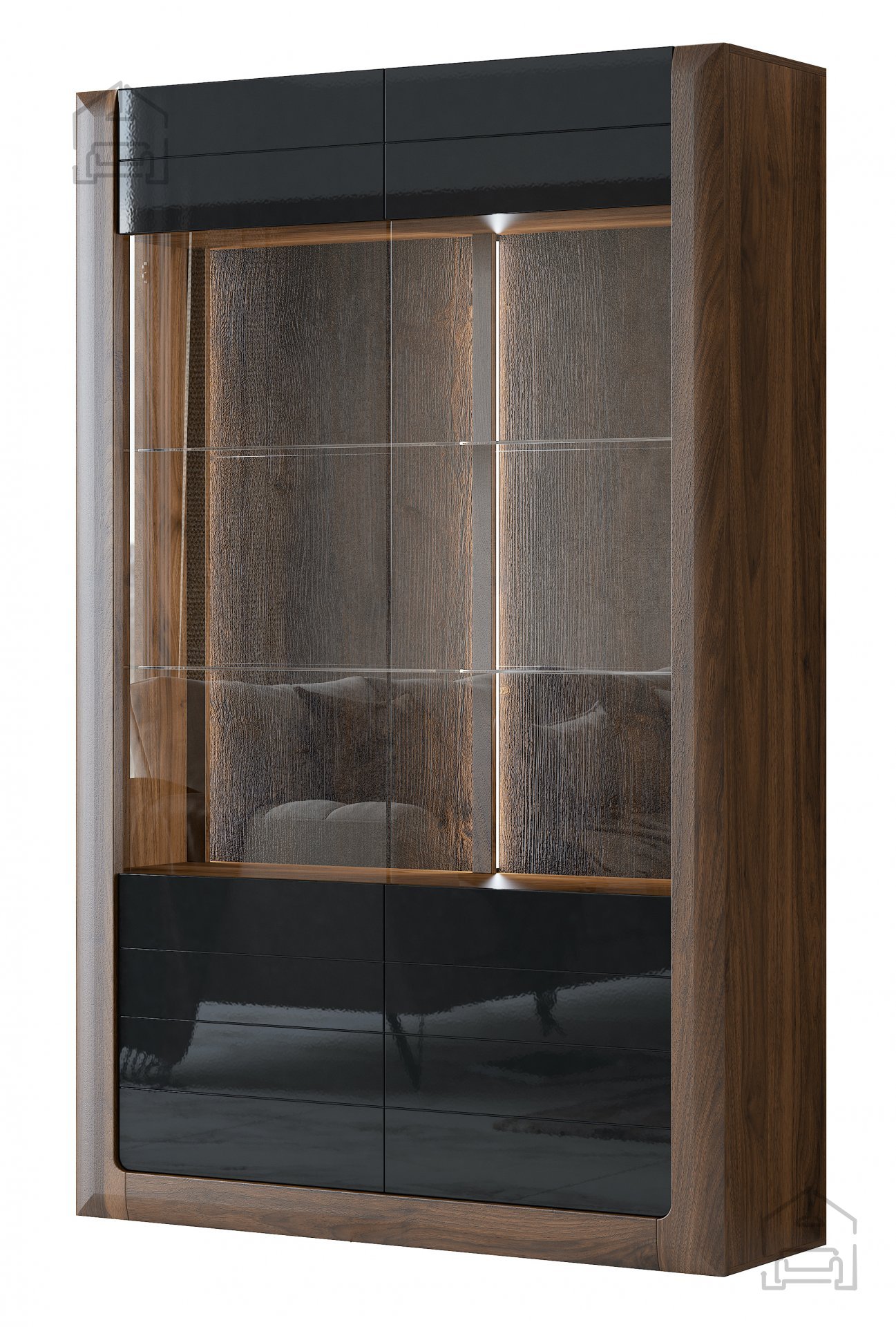Entdecken Sie die perfekte Kombination aus Eleganz und Funktionalität mit der Vitrine Kasai in Nuss Columbia und Schwarz Hochglanz. Dieses besondere Möbelstück ergänzt Ihr Wohnzimmer oder Esszimmer mit moderner Optik und durchdachtem Design. Gefertigt aus hochwertiger, laminierter Platte bietet die Vitrine Kasai die nötige Stabilität und Langlebigkeit für den Alltag – und bringt gleichzeitig einen Hauch von Raffinesse in Ihr Zuhause.