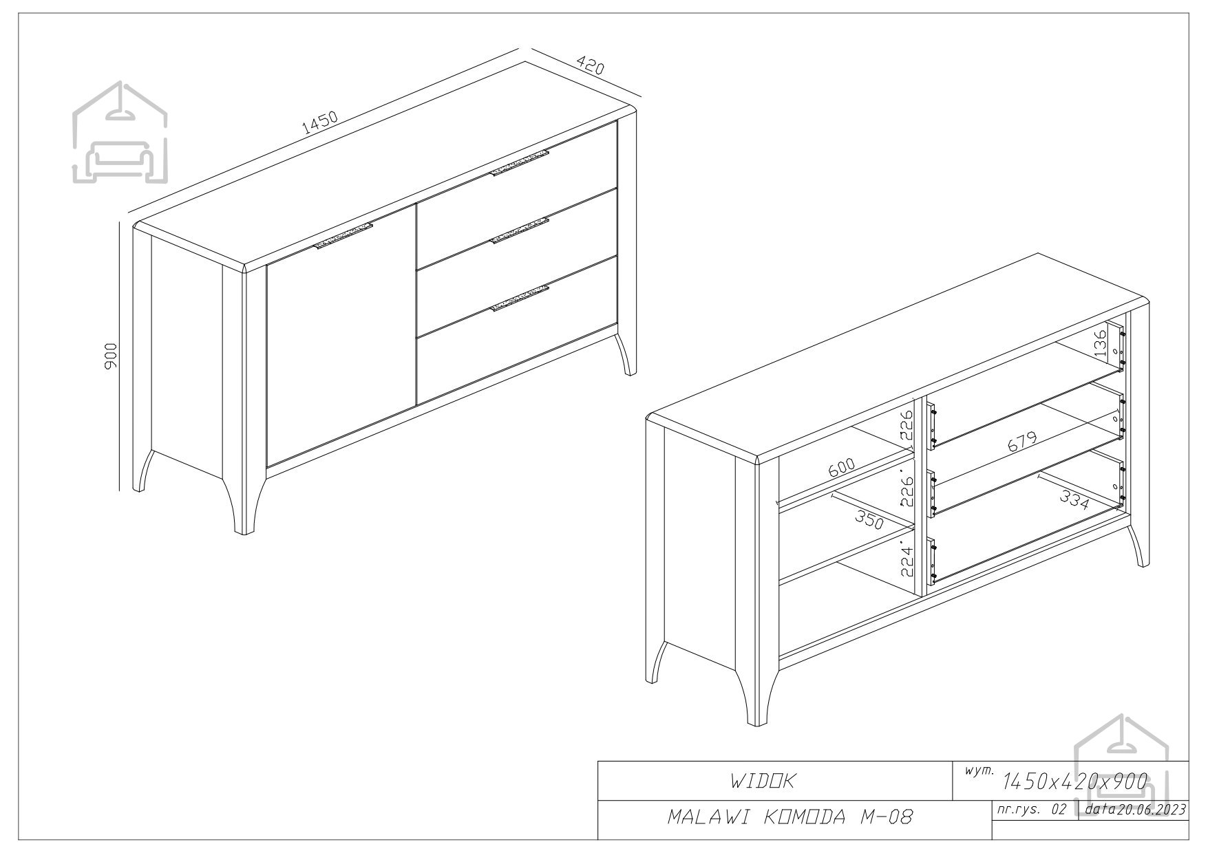 Die Kommode Malawi – Helvetia Meble vereint modernes Design, sorgfältige Verarbeitung und hohe Funktionalität. Sie besteht aus widerstandsfähiger, laminierter Platte, die für ihre Robustheit und Pflegeleichtigkeit bekannt ist. Die Oberfläche in warmen Brauntönen mit natürlicher Holzoptik verleiht dem Raum eine behagliche und wohnliche Atmosphäre. Mit einer Breite von 145 cm, einer Tiefe von 42 cm und einer Höhe von 91 cm bietet die Kommode ausreichend Stauraum, ohne den Raum optisch zu überladen.