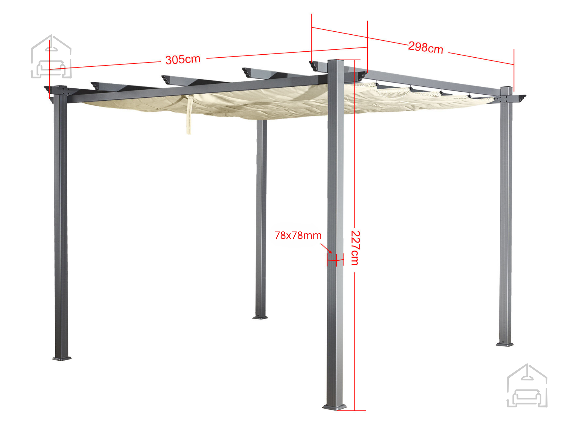 Dieser moderne und elegante Gartenpavillon mit den Maßen 3 m x 3 m ist die ideale Lösung für alle, die eine stilvolle und zugleich funktionale Beschattung suchen.