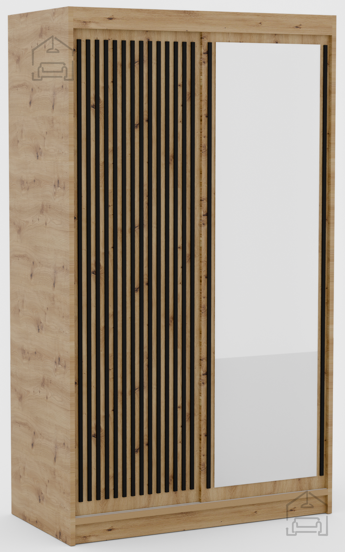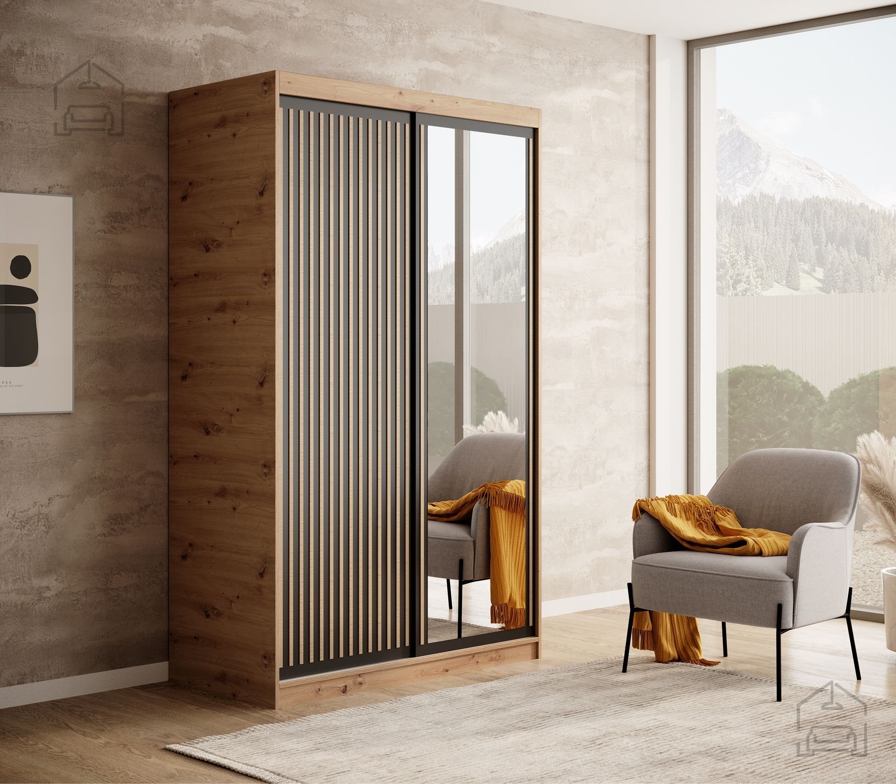 Mit den Maßen 120x60x205 cm nimmt der Schrank nicht viel Platz ein und bietet dennoch überraschend viel Stauraum. Die Schiebetüren lassen sich leicht bedienen und sparen Platz, da kein zusätzlicher Raum zum Öffnen benötigt wird. Der integrierte Spiegel an der Tür ermöglicht es Ihnen, Ihr Outfit im Handumdrehen zu überprüfen – ganz ohne separates Standspiegel.