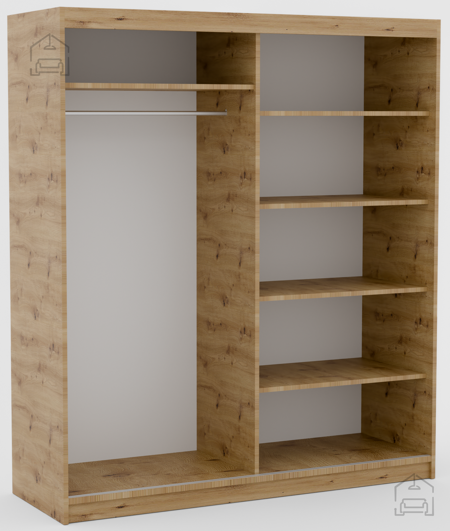 Durch die durchdachte Gestaltung ist dieser Schrank eine hervorragende Lösung für Schlafzimmer, Vorzimmer oder Ankleideräume. Er verfügt über großzügige Ablagefächer für Kleidung, Bettwäsche oder Accessoires sowie über eine stabile Kleiderstange, die Ihre Kleidung ordentlich und faltenfrei hält. Die Schiebetüren laufen auf hochwertigen Aluminiumführungen, was für ein leichtes Öffnen und Schließen sorgt und im Vergleich zu klassischen Drehtüren Platz spart – ideal für kleinere Räume, in denen jeder Zentimeter zählt.