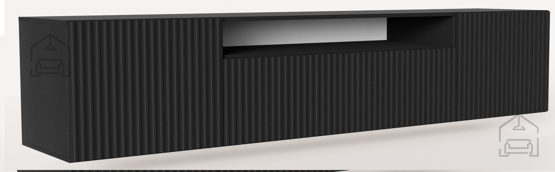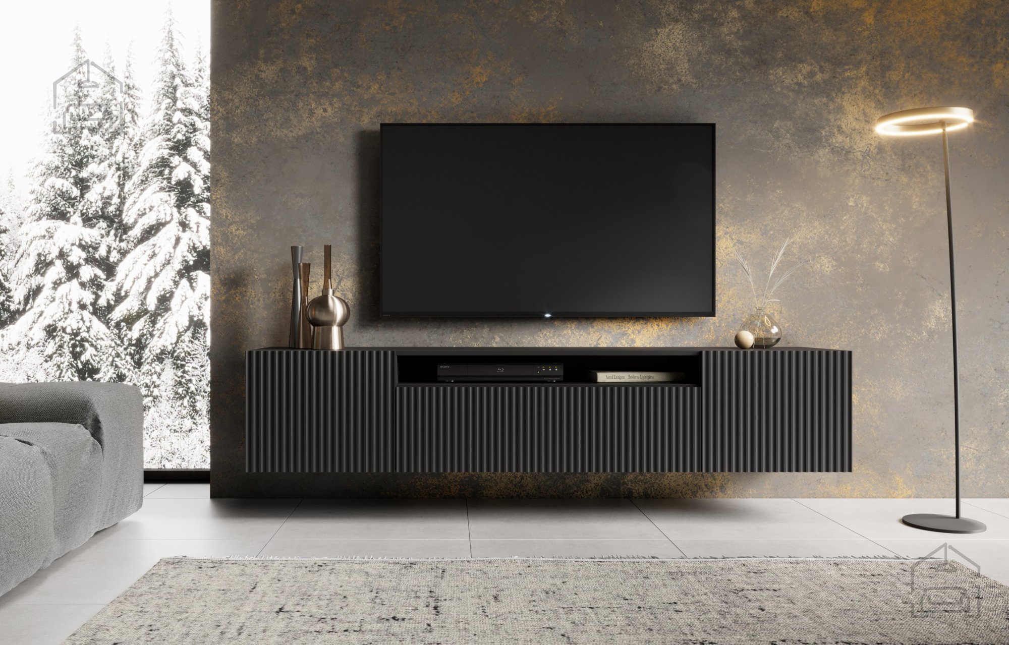 ADRK (Polen) 200 × 41 × 40 cm, Wandmontage, 16 mm laminierte Spanplatte und 18 mm gefräste MDF-Platte: Das moderne schwarze TV-Board Noemi ist ideal für alle, die im Wohnzimmer Eleganz, Funktionalität und klare Linien ohne überflüssige Elemente am Boden vereinen möchten. Durch die Wandmontage wirkt der Raum optisch leichter, während gleichzeitig ausreichend Platz für Multimedia-Geräte und Zubehör bleibt. Die tiefschwarze Oberfläche lässt sich wunderbar mit verschiedenen Farbkonzepten kombinieren – von hellen, minimalistischen Tönen bis hin zu warmen Holznuancen.