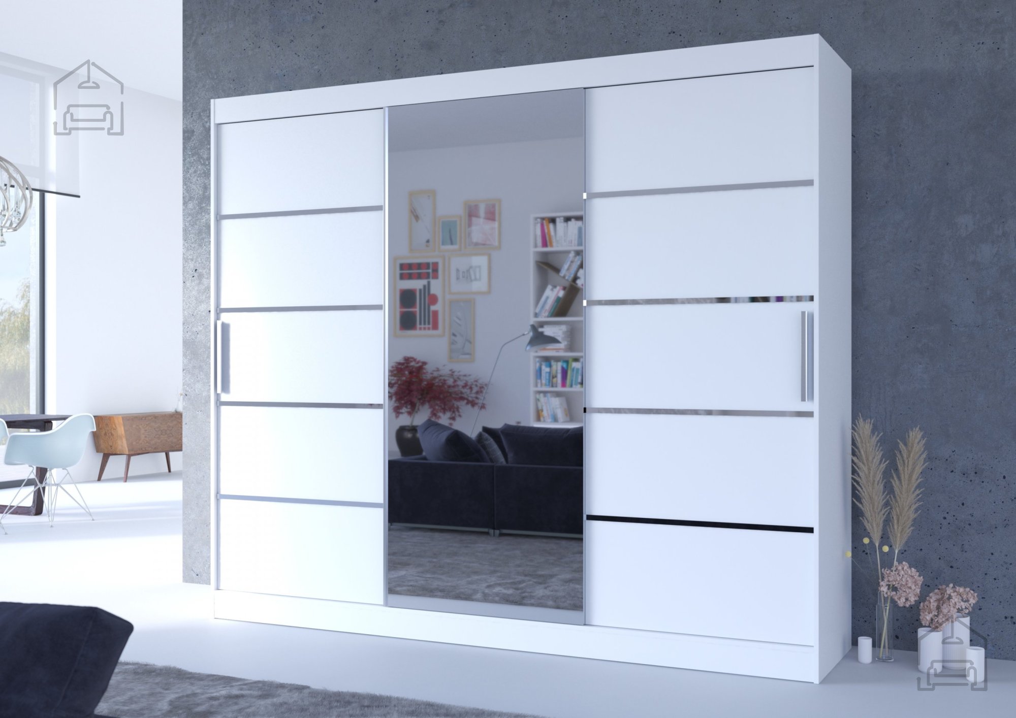 Der elegante und großzügige Kleiderschrank mit Schiebetüren ist die perfekte Lösung für alle, die in ihrem Zuhause mehr Ordnung, Stil und Funktionalität schaffen möchten. Das reine Weiß passt hervorragend zu modernen wie auch klassischen Einrichtungen, während die klaren Linien für einen zeitlosen Look sorgen, der sich leicht mit anderen Möbelstücken kombinieren lässt. Der Schrank überzeugt nicht nur optisch, sondern auch durch seine praktische Seite – mit seinen Maßen von 250 x 58 x 215 cm bietet er jede Menge Platz für Kleidung, Schuhe und Accessoires.