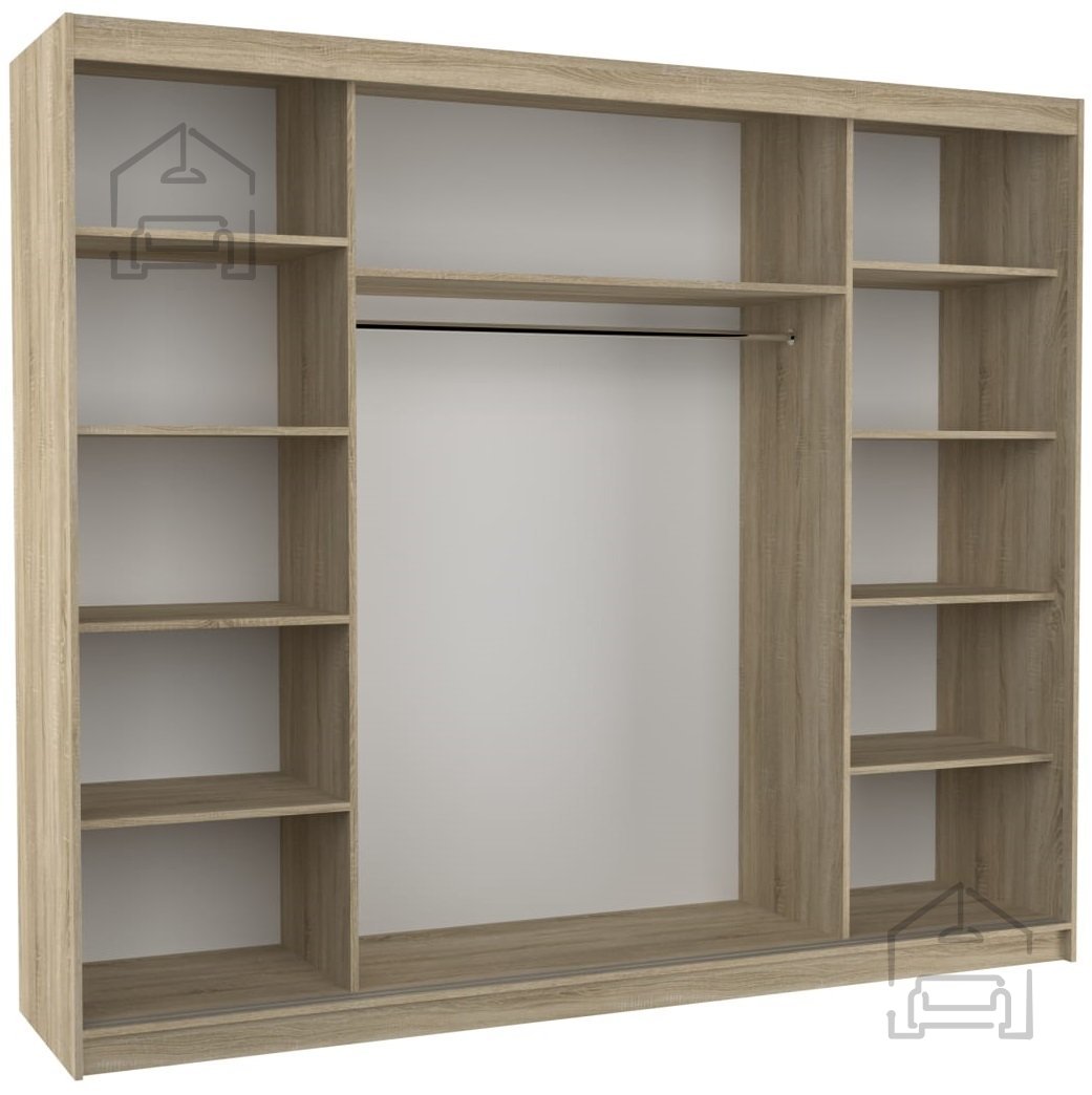 Dank der Schiebetüren ist dieser Schrank ideal für kleine wie große Räume, da beim Öffnen kein zusätzlicher Platz benötigt wird. So bleibt Ihr Schlafzimmer oder Vorzimmer stets ordentlich und geräumig. Das Innenleben ist so gestaltet, dass eine optimale Organisation möglich ist – eine Kombination aus Regalböden und Kleiderstangen sorgt dafür, dass Ihre Kleidung übersichtlich verstaut und jederzeit griffbereit ist. Für einen noch edleren Look kann optional eine LED-Beleuchtung ergänzt werden, die dem Raum eine moderne Note verleiht und das Suchen nach Kleidung auch am Abend erleichtert.