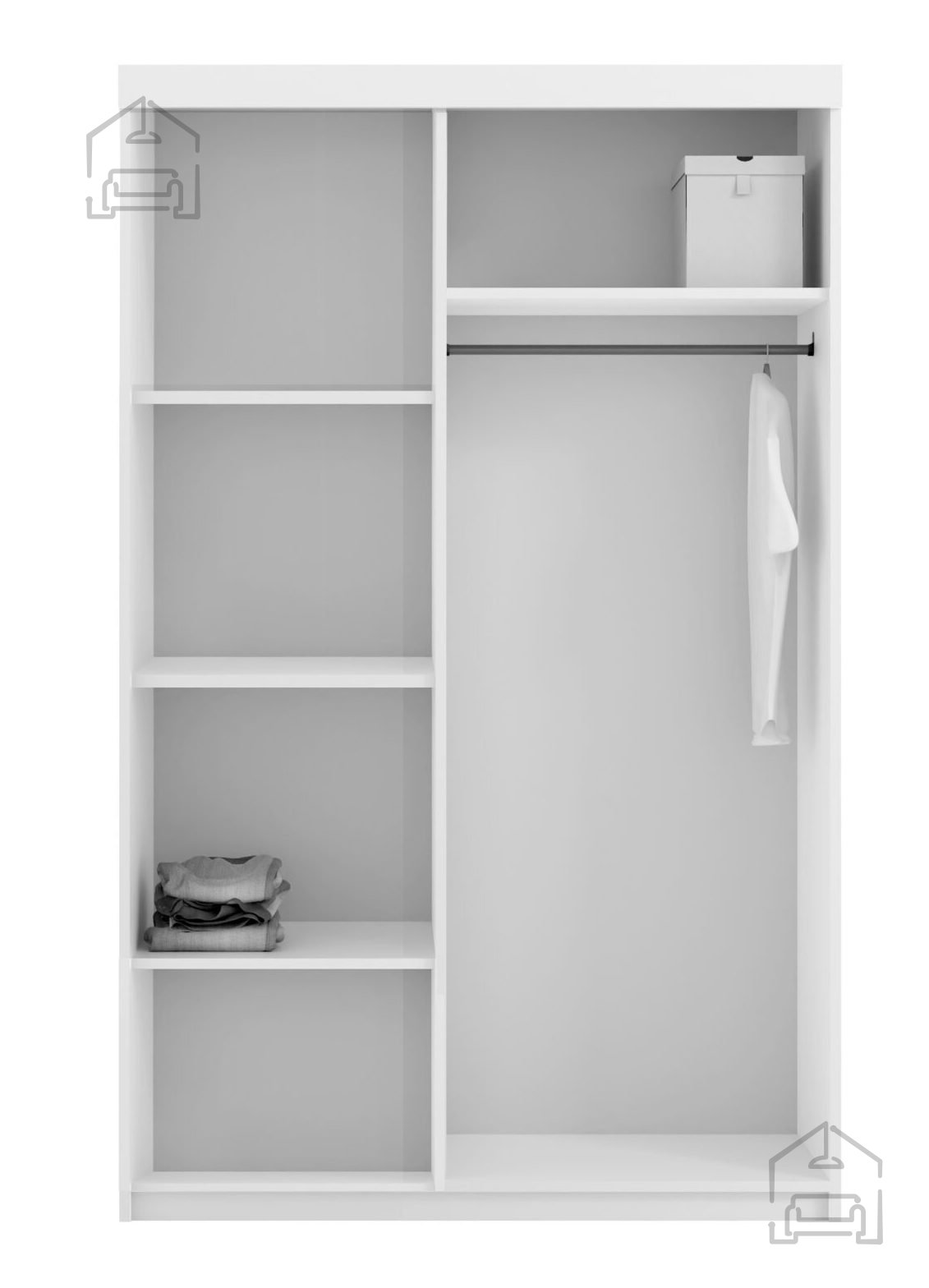 Der Kleiderschrank German 150 – Arkos meble wurde für Menschen entwickelt, die Wert auf Ordnung und Übersicht legen. Das Innenleben ist so gestaltet, dass verschiedene Kleidungsstücke – von langen Mänteln bis zu kleineren Accessoires – optimal verstaut werden können. Auf einer Seite befindet sich eine großzügige Kleiderstange für Hemden, Kleider und Jacken, auf der anderen Seite mehrere Regalböden, auf denen Pullover, T-Shirts oder Boxen mit Accessoires Platz finden. Diese Aufteilung sorgt für eine effiziente Raumnutzung und einen guten Überblick über Ihre Garderobe – ideal für die tägliche Kleiderwahl.