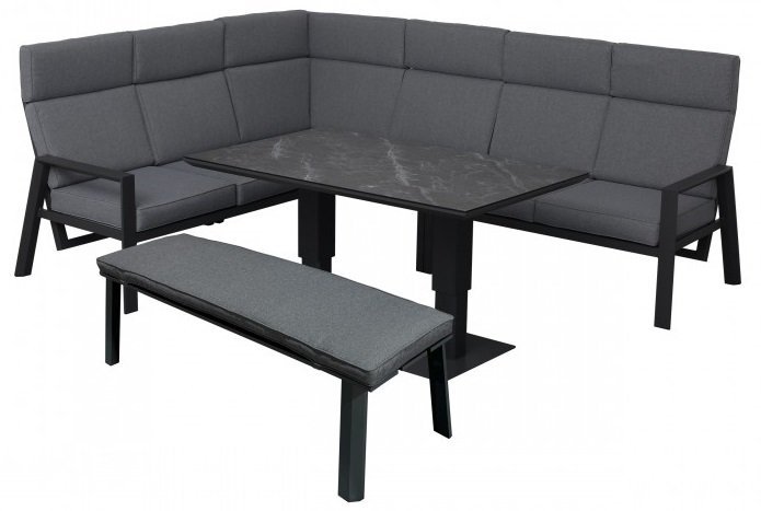 Das Gartenmöbel-Set Avignon ist nicht nur optisch ein Highlight, sondern auch ein funktionales Ensemble, perfekt für gesellige Stunden im Freien. Die Eckcouch bietet viel Platz zum entspannten Sitzen, während der höhenverstellbare Tisch mit einer Glaskeramikplatte flexibel an verschiedene Anlässe angepasst werden kann – vom schnellen Frühstück bis zum gemütlichen Abendessen. So wird der gleiche Bereich im Handumdrehen zum Ess- oder Loungebereich, ohne dass das klare, moderne Gesamtbild verloren geht.
