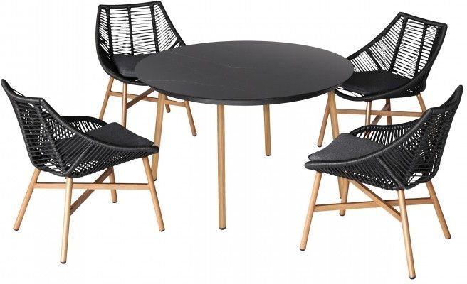 Ein elegantes Essmöbel-Set für 4 Personen, das sich perfekt für Garten, Terrasse oder den Innenbereich eignet. Zum Set gehören vier Stühle mit bequemen Sitzpolstern sowie ein großer runder Tisch. Das Gestell besteht aus Aluminiumrahmen, was für Stabilität und Langlebigkeit sorgt. Außerdem ist das Material korrosionsbeständig, sodass das Ensemble seinen Charme lange behält. Die Sitzflächen sind sorgfältig aus Polyrattan geflochten – das sorgt nicht nur für angenehmen Komfort, sondern auch für UV-Beständigkeit. Ein weiterer Vorteil ist die einfache Reinigung. Die Polyesterkissen sind besonders feuchtigkeitsresistent und somit ideal für den langfristigen Gebrauch. Die Tischplatte wirkt edel und bietet Komfort im Alltag, während die handbemalten Tischbeine in Holzoptik dem Set eine feine, natürliche Note verleihen.