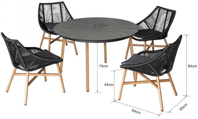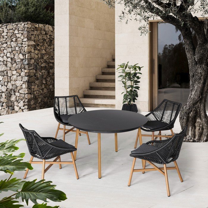 Die passende Tischhöhe und die großzügige Platte machen das Set ideal für gemütliche Mahlzeiten – perfekt für Terrasse oder Garten. Auch im Esszimmer oder in der Küche kommt das Ensemble hervorragend zur Geltung und verleiht jedem Raum eine elegante, zugleich funktionale Note. Das Möbelset wurde mit Blick auf Vielseitigkeit entworfen: Der klassische runde Tisch in Kombination mit modernen Stühlen ist eine tolle Wahl für Liebhaber zeitgemäßen Designs. Die harmonische Verbindung von Graphit und Holzoptik passt wunderbar zu unterschiedlichsten Wohnstilen.