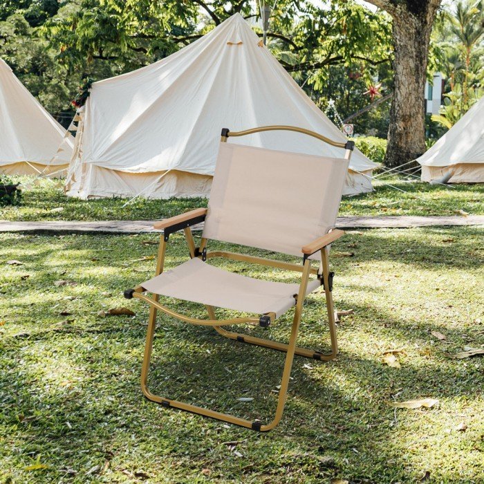 Sitzfläche und Rückenlehne sind aus 600D-Polyester gefertigt, einem wetterfesten und pflegeleichten Material. Der Stoff trocknet rasch und behält auch nach längerer Nutzung seine Form. Die Struktur ist angenehm weich, aber dennoch stabil genug, um sicheren Halt zu bieten. Die beige Farbe sorgt für eine natürliche, freundliche Optik, die sich gut mit anderen Gartenmöbeln oder Campingausstattungen kombinieren lässt.
