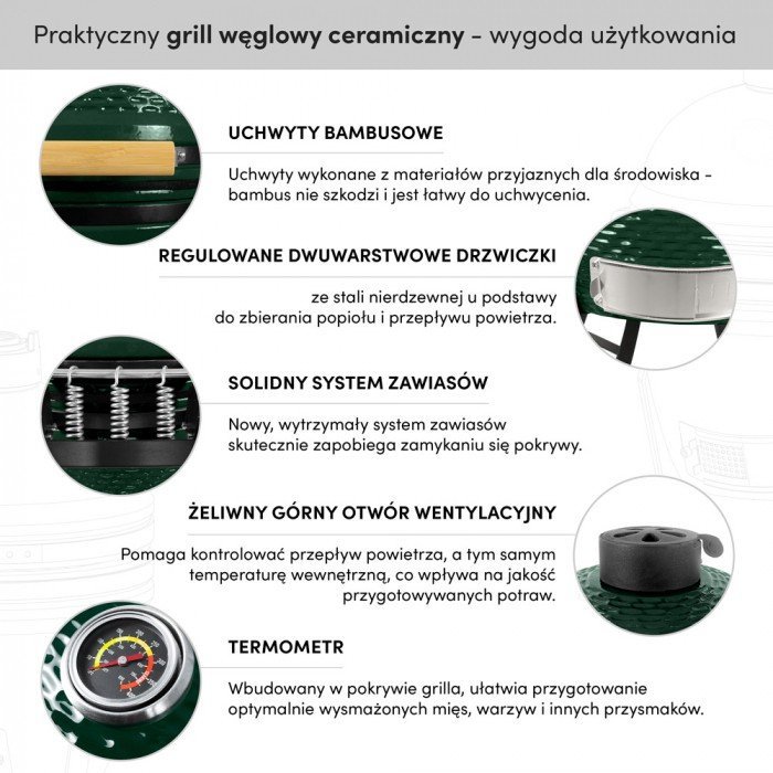 Ein moderner Keramik-Holzkohlegrill, der nicht nur hervorragende Grilleigenschaften, sondern auch ansprechendes Design und Funktionalität vereint. Dank seines eleganten Erscheinungsbilds und der robusten Bauweise ist er ein echter Blickfang auf jeder Terrasse. Der Hauptkorpus mit einem beeindruckenden Durchmesser von 32 cm bietet ausreichend Platz für die Zubereitung köstlicher Speisen. Der Grillrost mit 26,5 cm Durchmesser sorgt für gleichmäßiges Garen – ganz gleich, welche Lebensmittel Sie zubereiten. Gefertigt aus emailliertem Porzellan, ist der Grill nicht nur pflegeleicht, sondern überzeugt auch durch eine optimale Wärmeleitung, die für gleichmäßiges Grillen sorgt. Die Brennkammer besteht aus dem hitzebeständigen Material Mullit und hält Temperaturen bis zu 1000 °C stand – das garantiert Langlebigkeit und Sicherheit beim Grillen.