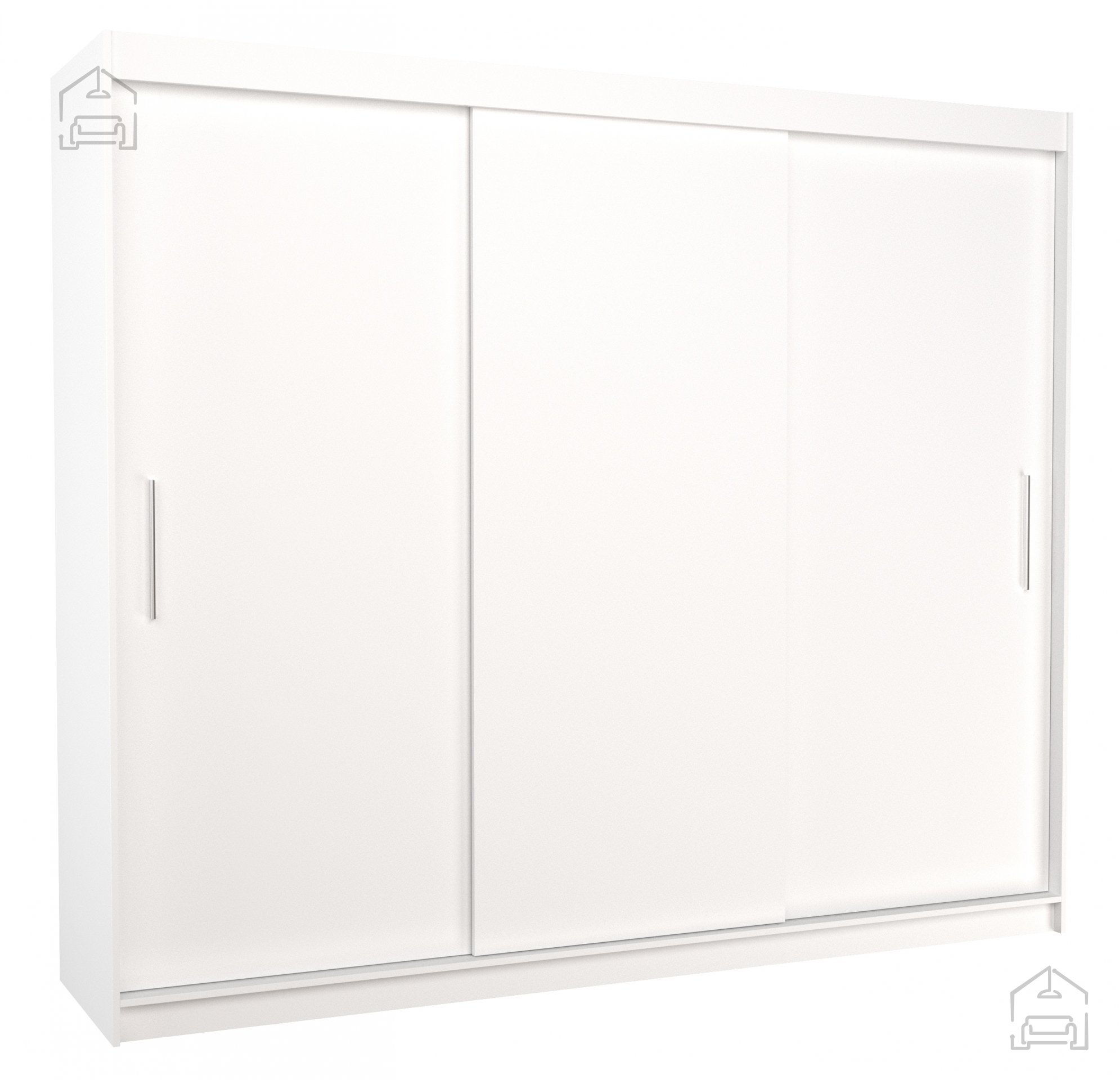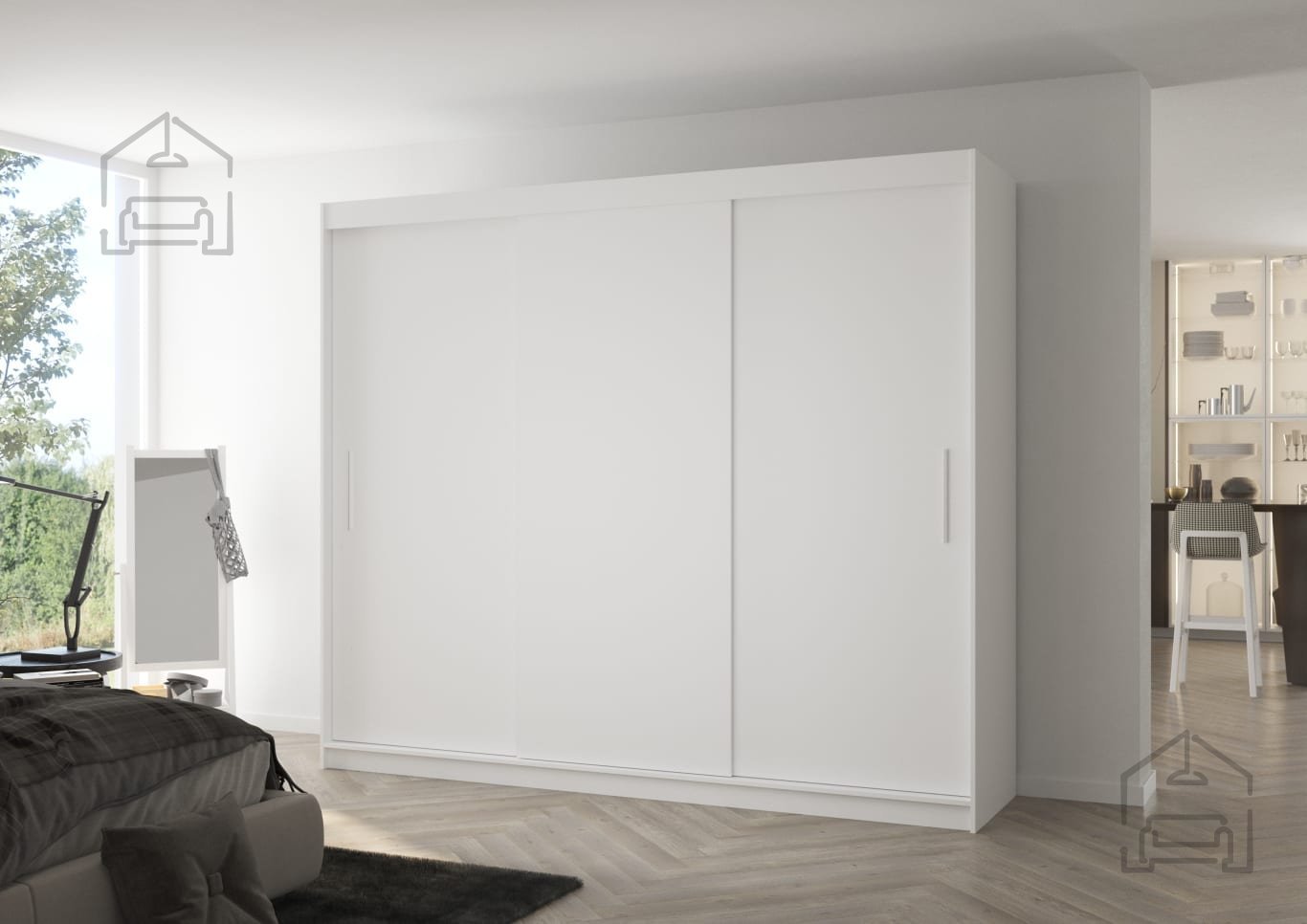 Praktikabilität und Eleganz treffen hier aufeinander – modernes Möbel, das nicht nur ein unverzichtbarer Bestandteil jedes Zuhauses ist, sondern auch zur harmonischen Raumgestaltung beiträgt. Der geräumige Kleiderschrank mit Schiebetüren in klassischem Weiß ist ideal für alle, die Ordnung, Funktionalität und modernes Design schätzen. Mit einer Breite von 250 cm, einer Tiefe von 58 cm und einer Höhe von 215 cm bietet er großzügigen Stauraum für Kleidung, Schuhe und Accessoires, während seine schlichte, minimalistische Formensprache sich perfekt in jedes Schlafzimmer, Vorzimmer oder Ankleidezimmer einfügt.