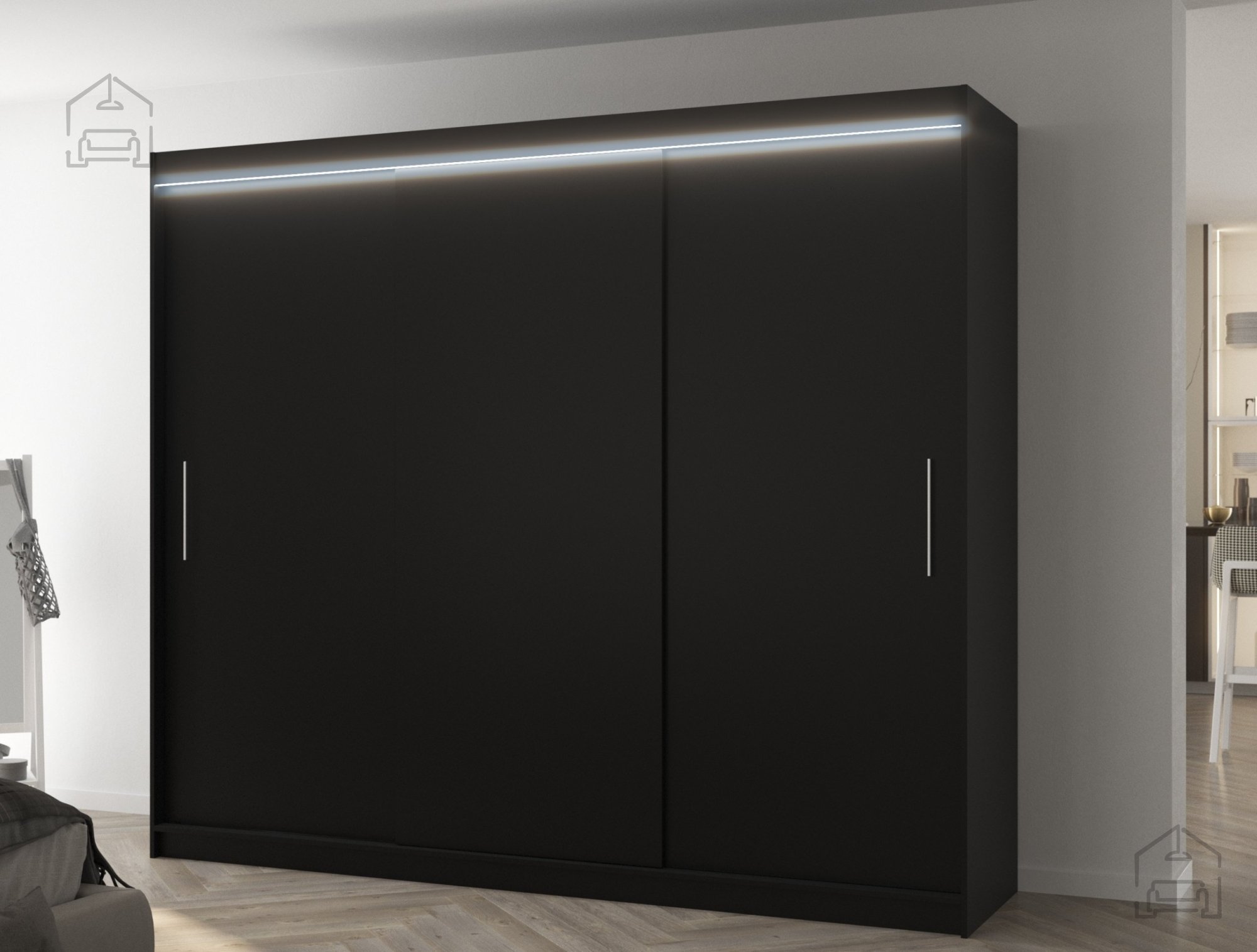 Die schwarze Farbe des Schranks verleiht ihm einen zeitlosen Look, der zu verschiedensten Einrichtungsstilen passt – von minimalistisch bis klassisch. Die Oberfläche aus hochwertigem Spanplatten- und MDF-Material ist robust, widerstandsfähig im Alltag und leicht zu reinigen. Dank der klaren Linien und der Schiebetüren wirkt der Schrank dezent, aber dennoch edel. Auf Wunsch kann er mit stilvollen LED-Leuchten (gegen Aufpreis erhältlich) ergänzt werden, die eine angenehme Lichtstimmung schaffen und das Suchen nach Kleidung auch am Abend erleichtern.