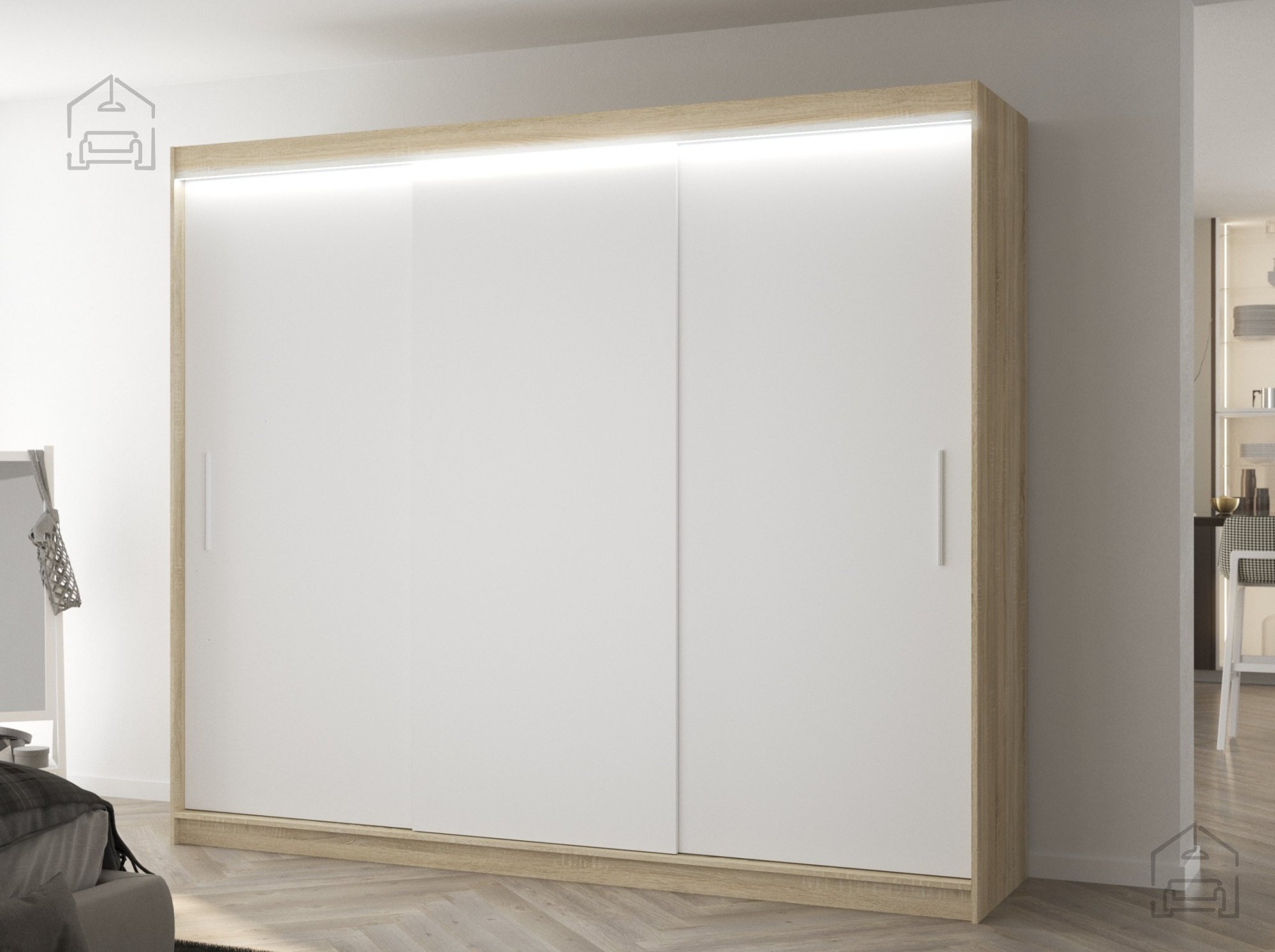 Wenn Sie einen hochwertigen, geräumigen und eleganten Schwebetürenschrank suchen, der Funktionalität mit modernem Design verbindet, ist dieses Modell die richtige Wahl. Mit seiner zeitlosen Farbkombination, der optionalen LED-Beleuchtung und dem cleveren Innenaufbau erfüllt er auch hohe Ansprüche.