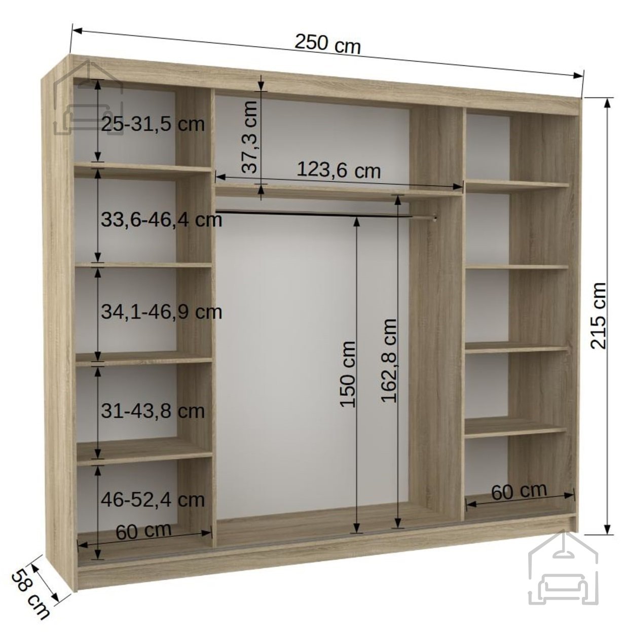 Eine elegante und zugleich funktionale Lösung für das moderne Zuhause ist dieser Kleiderschrank mit Schiebetüren in der harmonischen Kombination aus Weiß und Sonoma-Eiche. Mit seiner beeindruckenden Breite von 250 cm und einer Höhe von 215 cm bietet er jede Menge Stauraum für Kleidung, Schuhe und Accessoires. Dank der Schiebetüren wird der vorhandene Platz optimal genutzt – ohne zusätzlichen Raum zum Öffnen der Türen zu benötigen.
