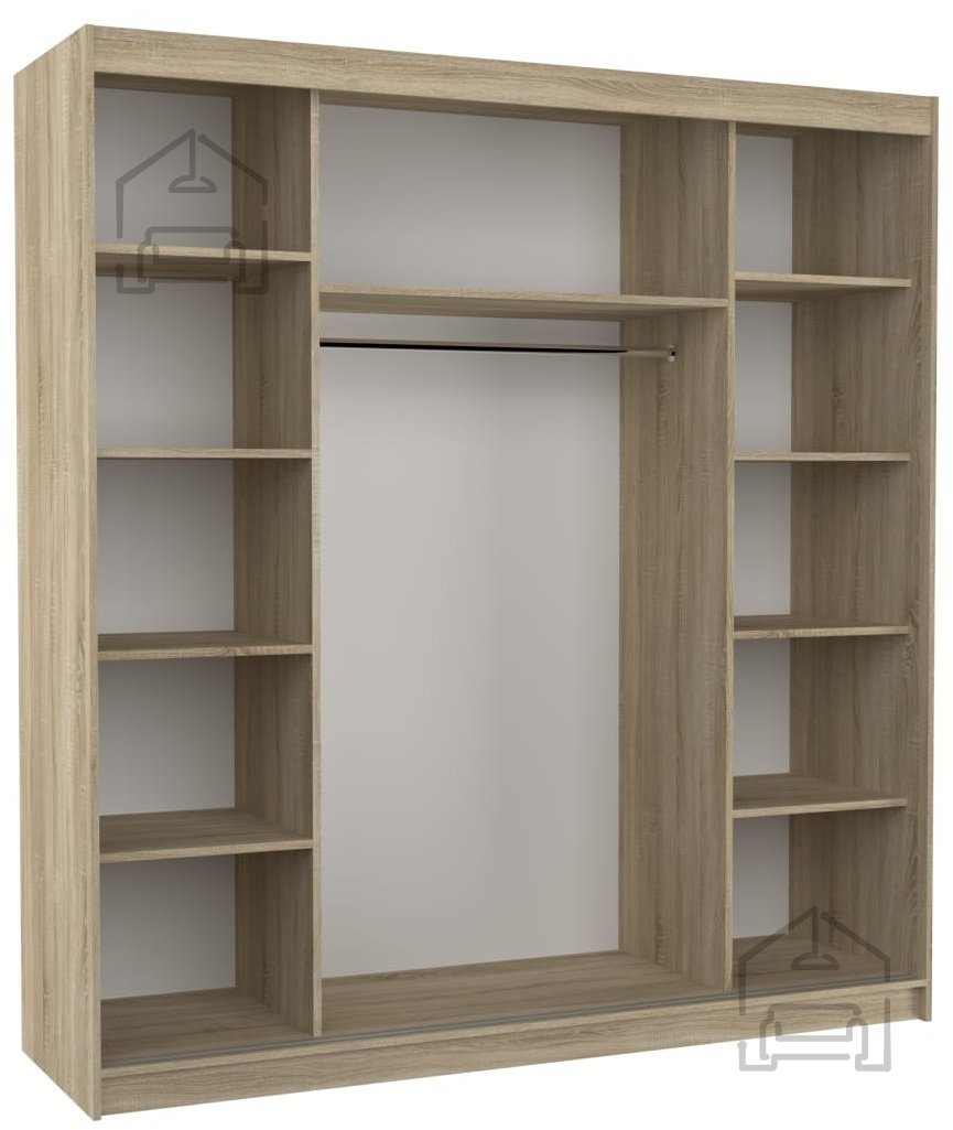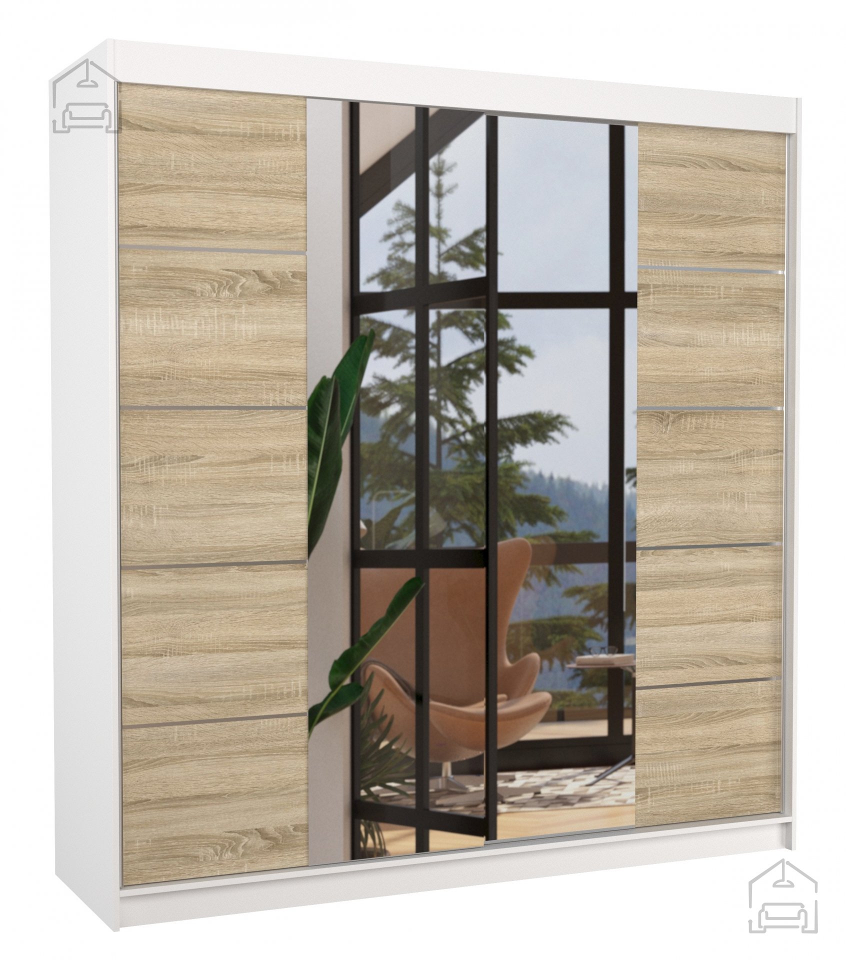 Eleganz und Funktionalität vereinen sich in einem Möbelstück, das Ihr Schlafzimmer oder Ihren Vorraum in einen aufgeräumten, übersichtlichen und modernen Raum verwandelt. Der Schiebetürenschrank in der Kombination aus Weiß und Sonoma-Eiche ist so gestaltet, dass er praktischen Nutzen mit modernem Design verbindet. Dank seiner beeindruckenden Höhe und der durchdachten Innenaufteilung bietet er reichlich Stauraum für Kleidung, Accessoires und saisonale Stücke. Durch den Schiebemechanismus benötigt er beim Öffnen keinen zusätzlichen Platz – ideal also sowohl für großzügige Schlafzimmer als auch für kleinere Wohnungen oder schmale Flure.