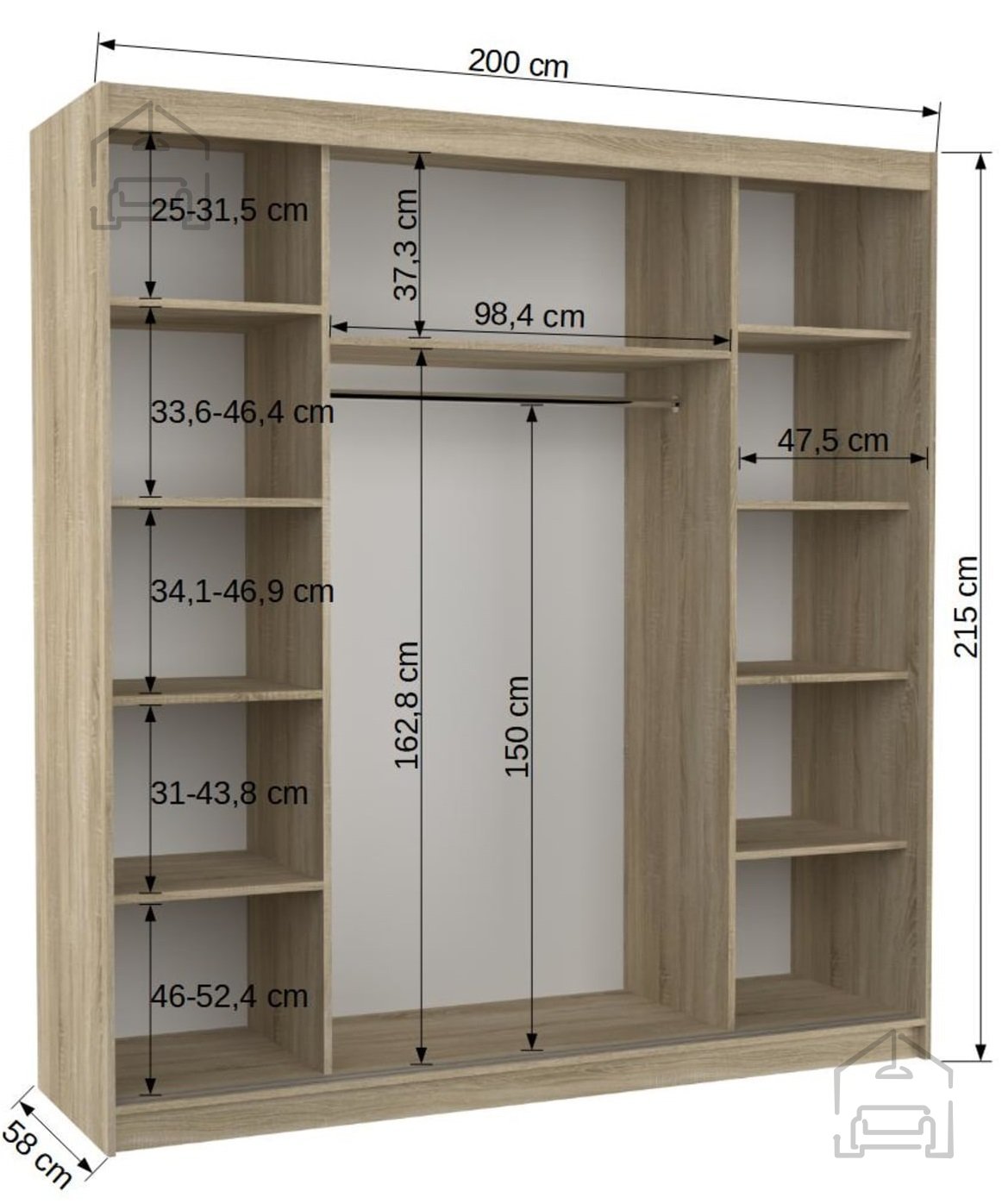 Mit den Maßen 200x58x215 cm steht Ihnen ausreichend Platz zur Verfügung, um Ihre Garderobe ordentlich zu organisieren. Innen finden Sie eine Kombination aus geräumigen Ablagefächern und einer Kleiderstange, die eine übersichtliche Aufbewahrung verschiedenster Kleidungsstücke ermöglicht – von Hemden und Kleidern bis hin zu Wintermänteln und Sportoutfits. Auf den Einlegeböden lassen sich Pullover, Taschen oder Boxen mit Accessoires verstauen, während an der Kleiderstange Teile hängen können, die faltenfrei bleiben sollen. So behalten Sie immer den Überblick und haben alles schnell zur Hand.