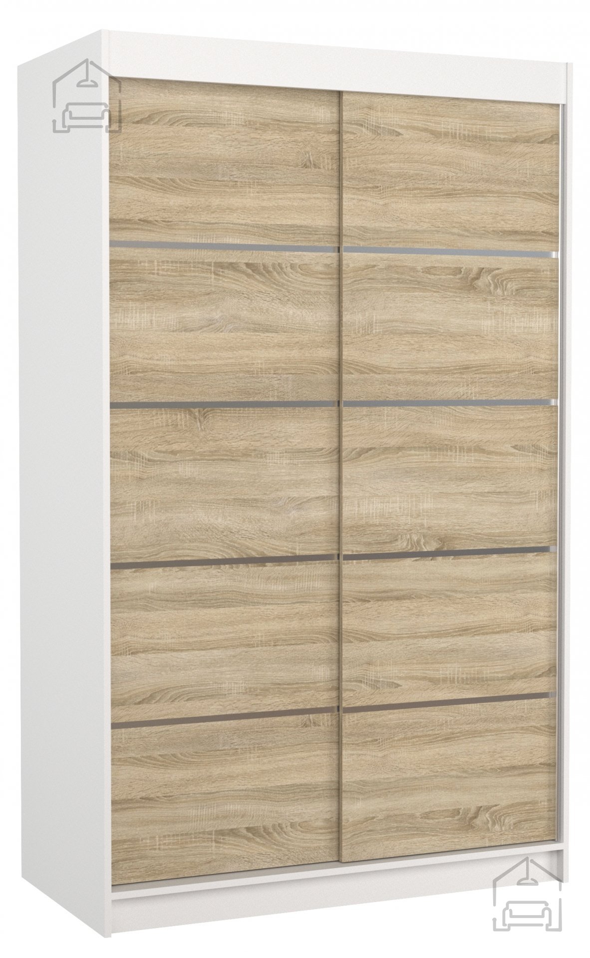 Mit den Maßen von 120x58x200 cm benötigt der Schrank nur wenig Platz, bietet aber dennoch überraschend viel Stauraum. Die Schiebetüren sind besonders praktisch, da sie beim Öffnen keinen zusätzlichen Raum beanspruchen – ideal für kleinere Zimmer oder schmale Flure. Die Front in Sonoma-Eiche kombiniert mit dem weißen Korpus sorgt für einen harmonischen Kontrast und einen natürlichen Look, der sich sowohl in moderne als auch klassische Einrichtungen bestens einfügt.