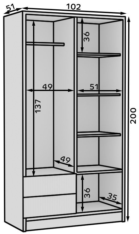 Mit den Maßen 100x51x200 cm bietet der Schrank ausreichend Platz für verschiedene Kleidungsstücke. Im Inneren sorgen durchdacht angeordnete Ablagen und ein Kleiderbereich für eine übersichtliche Organisation. Ob Sie elegante Kleider, Businesshemden oder ordentlich gefaltete Pullover, T-Shirts und Accessoires aufbewahren möchten – dieser Kleiderschrank bietet für alles den richtigen Platz. Das Design vereint Funktionalität mit Ästhetik, sodass Sie weder auf Stil noch auf Stauraum verzichten müssen.