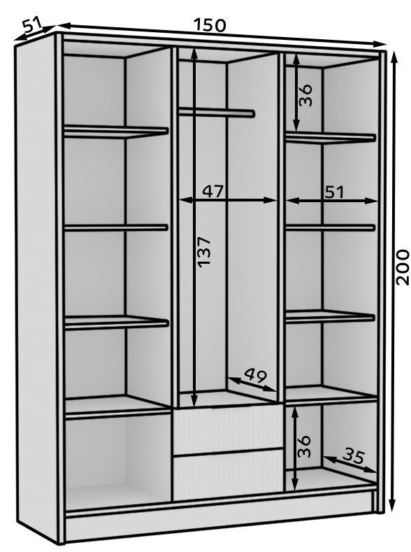 Die perfekte Wahl für alle, die Ordnung, Funktionalität und modernes Design schätzen, ist dieser Kleiderschrank, der mit seiner Kombination aus Weiß und Schwarz jedem Zuhause einen Hauch von Eleganz und Exklusivität verleiht. Mit einer Breite von 150 cm, einer Tiefe von 51 cm und einer Höhe von 200 cm bietet er reichlich Platz für Kleidung, Schuhe und Accessoires. Dank seiner durchdachten Gestaltung passt er sowohl in größere als auch in kleinere Räume. Dieser Schrank ist mehr als nur ein Möbelstück – er ist eine praktische Lösung für ein gepflegtes und stilvolles Zuhause.