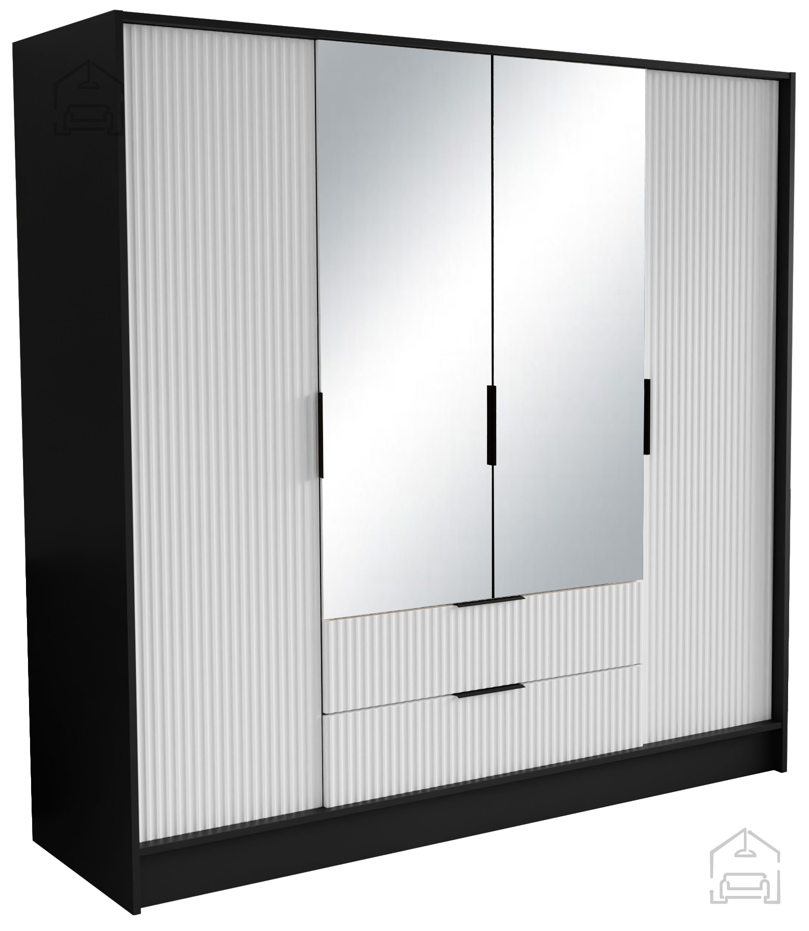 Der Kleiderschrank Norel in Schwarz-Weiß ist die perfekte Wahl für alle, die Funktionalität, Qualität und modernes Design schätzen. Machen Sie ihn zum zentralen Element Ihres Schlaf- oder Vorzimmers und genießen Sie ein aufgeräumtes, stilvolles und einladendes Wohnambiente.