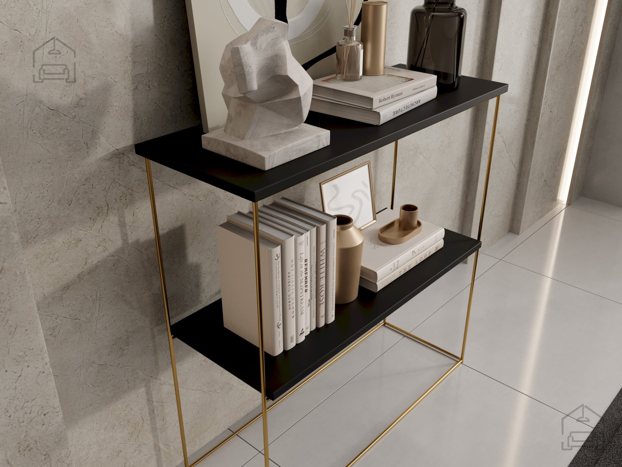 Bringen Sie mit einem ausgewählten Möbelstück einen Hauch von Glamour und moderner Eleganz in Ihr Zuhause – eine perfekte Kombination aus Funktionalität und ansprechendem Design. Dieser Schminktisch ist ideal für alle, die Wert auf stilvolles Design, hochwertige Materialien und zeitlose Optik legen. Die harmonische Verbindung von Schwarz und Gold passt sowohl zu minimalistischen Einrichtungen als auch zu opulenteren, dekorativen Wohnstilen. Dank der kompakten Maße von 80x30x80 cm fügt er sich mühelos auch in kleinere Räume ein und bietet dennoch genügend Fläche, um Ihr persönlicher Platz für Pflege oder Dekoration zu werden.
