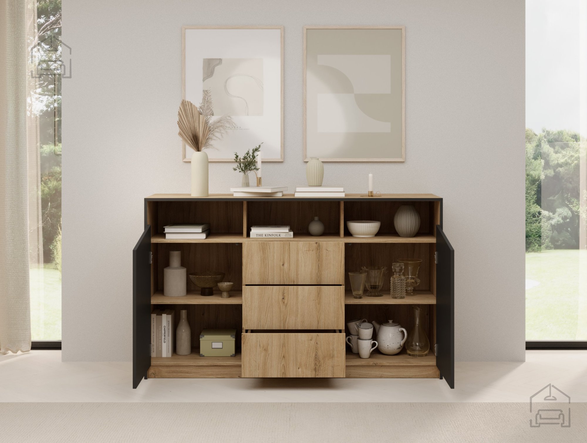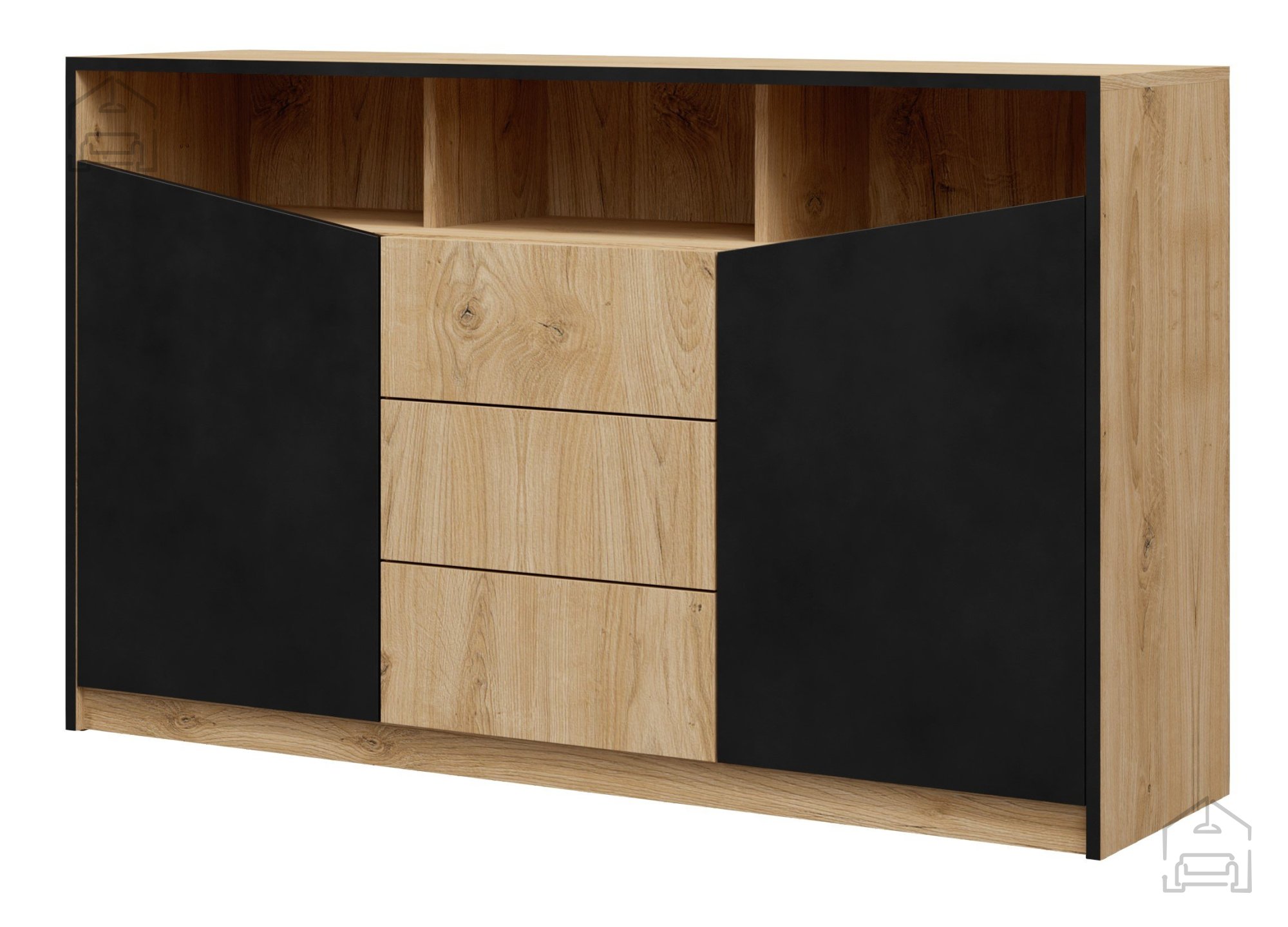 Die Kombination aus schwarzer Farbe und Eichedekor sorgt für ein modernes, zugleich gemütliches Erscheinungsbild, das sowohl zu minimalistischen als auch zu klassischen Einrichtungen passt. Die Oberfläche in natürlichem Eichenfarbton bringt Behaglichkeit ins Zuhause, während die schwarzen Elemente einen Hauch urbanen Luxus vermitteln. Dieser Kontrast macht die Kommode besonders attraktiv – optisch ausgewogen und vielseitig kombinierbar mit verschiedenen Farbkonzepten und Wohnstilen.