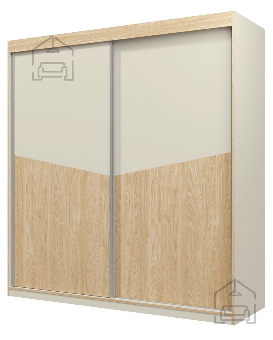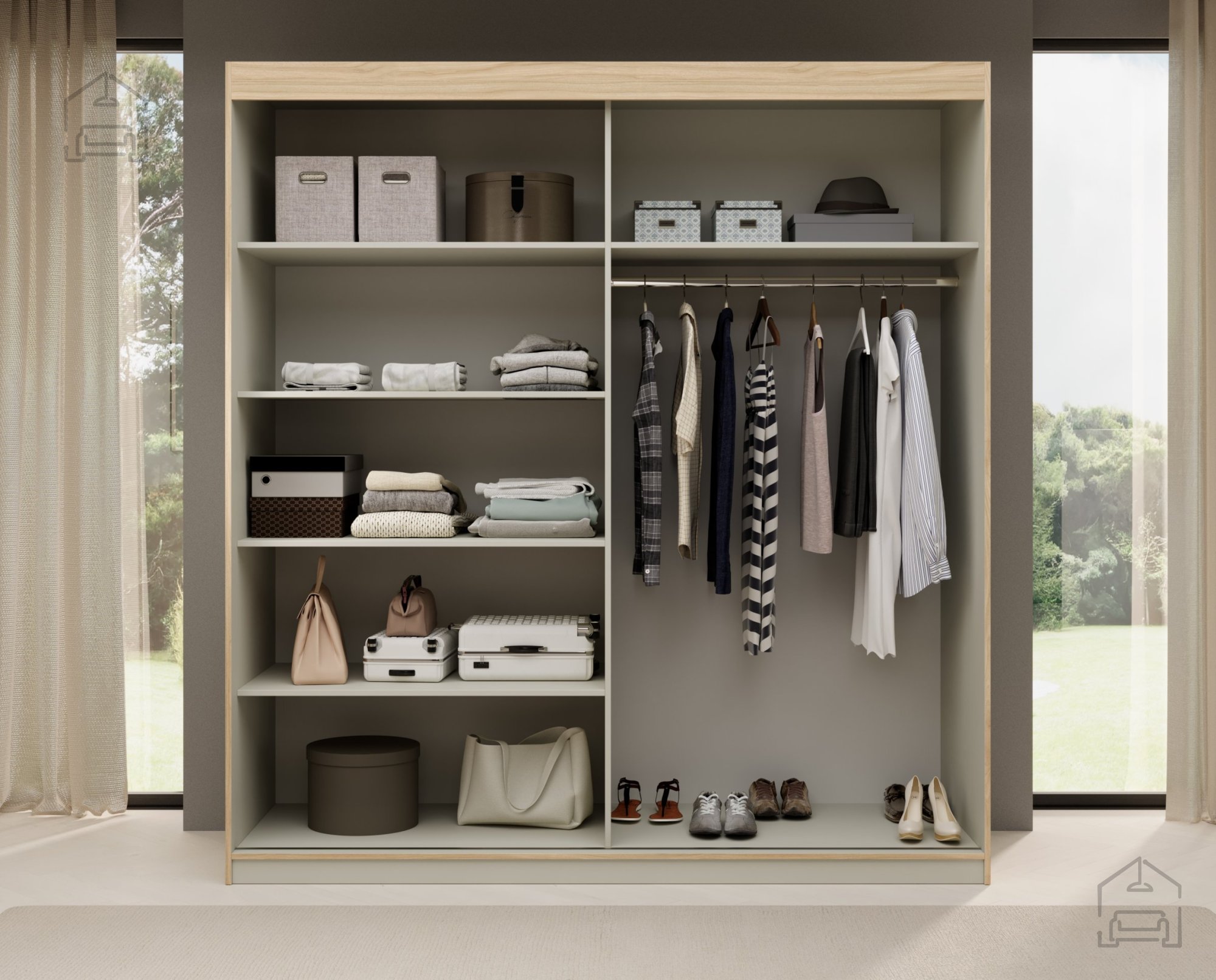 Mit den Maßen 200x65x216 cm bietet dieser Kleiderschrank außergewöhnlich viel Platz. Innen finden Sie eine Kombination aus Regalen, Fächern und Kleiderstangen, die das Aufbewahren unterschiedlich langer Kleidungsstücke – von Mänteln bis Hemden und Kleidern – erleichtern. Die Schiebetüren ermöglichen einen bequemen Zugriff auf den Inhalt und sparen gleichzeitig Platz – besonders praktisch für kleinere Schlafzimmer oder Singlewohnungen.