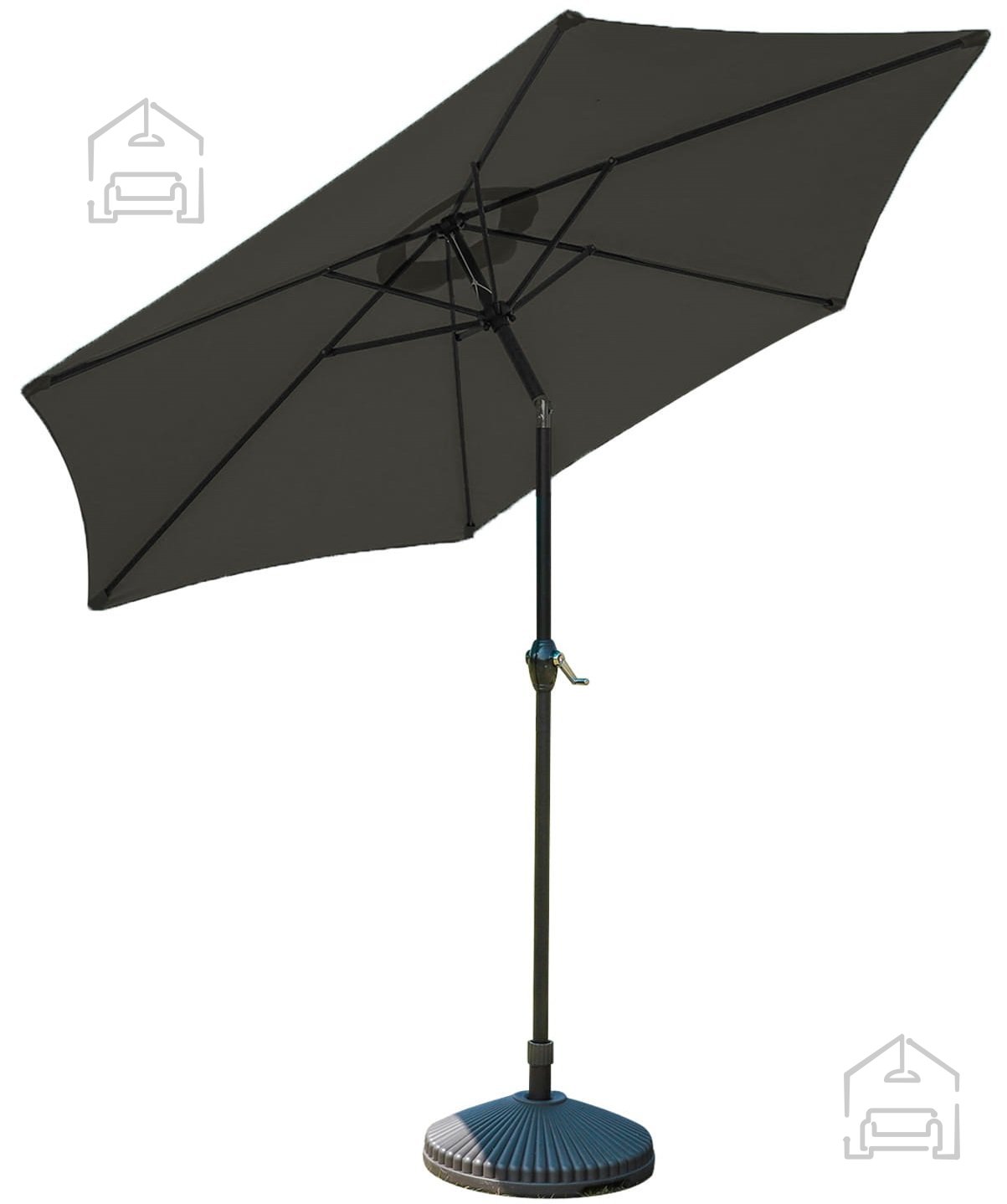 Zum Lieferumfang gehört ein Standfuß mit integriertem Wassertank, der zusätzliche Stabilität bietet, ohne dass separate Gewichte nötig sind. Je nach Bedarf kann der Tank mit Wasser oder Sand befüllt werden, um das Gewicht an Windstärke oder Untergrund anzupassen. So bleibt der Schirm auch bei leichtem Wind stabil und lässt sich bei Bedarf rasch entleeren und an einen anderen Platz stellen.