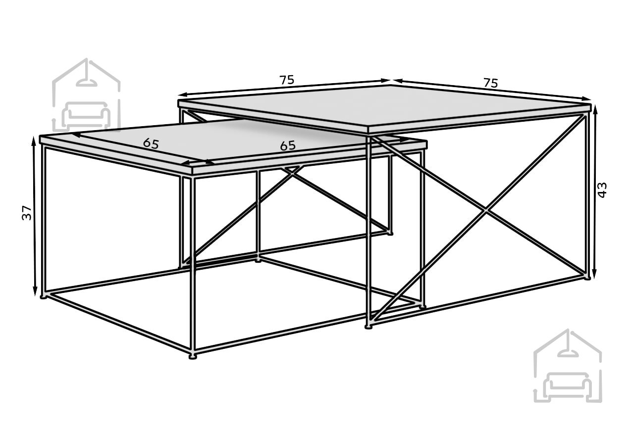 Das Set besteht aus einem größeren Tisch mit den Maßen 75x75x43 cm und einem kleineren mit 65x65x37 cm. Diese Gestaltung ermöglicht es, beide Tische gemeinsam als harmonisches Duo oder einzeln zu verwenden – je nach Platzangebot und Bedarf. Der kleinere Tisch lässt sich bei Bedarf einfach unter dem größeren verstauen, was Platz spart und eine flexible Raumgestaltung erlaubt. Eine ideale Lösung für kleinere Wohnungen, Studios oder für alle, die auf Anpassungsfähigkeit Wert legen.