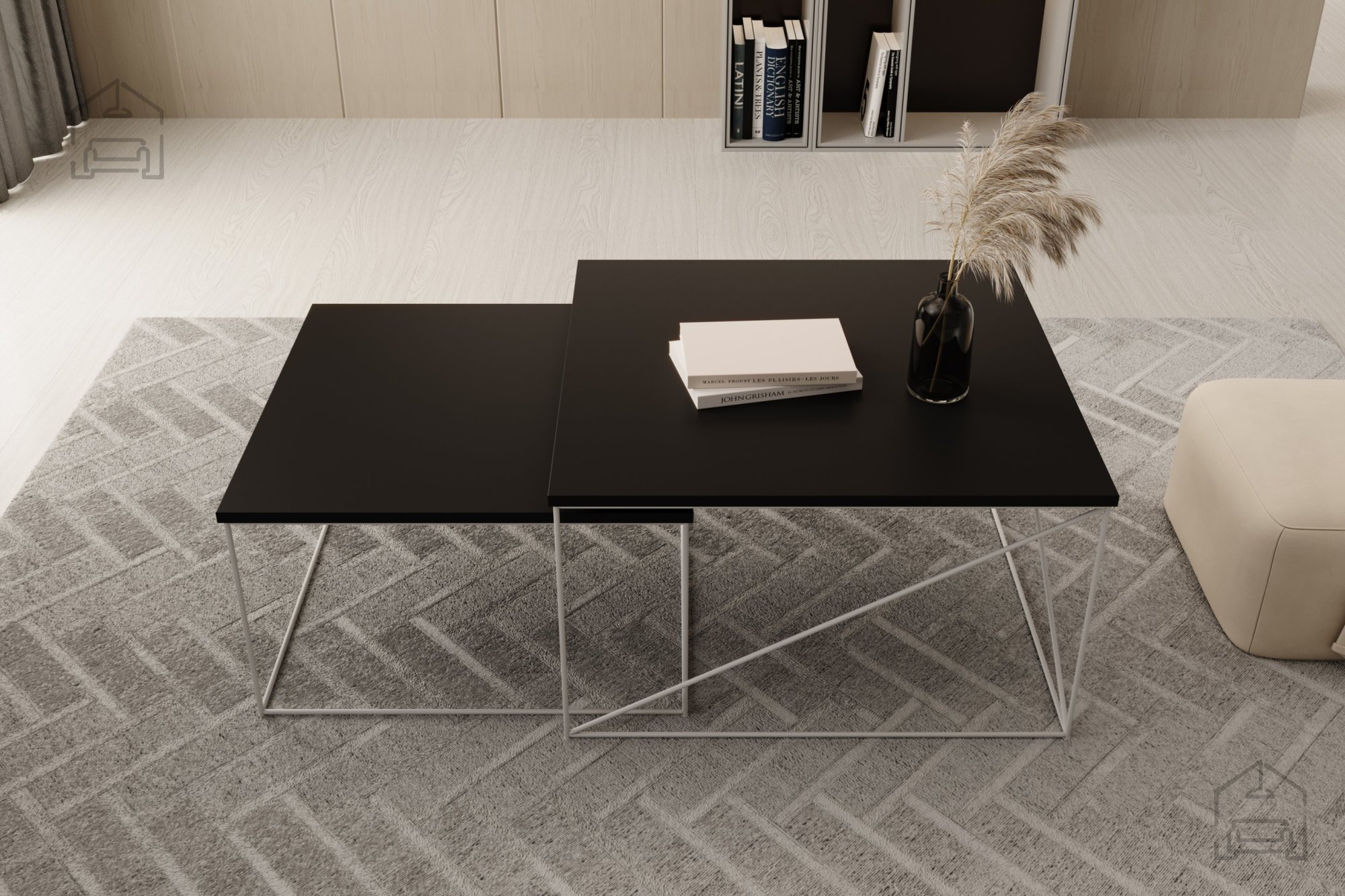 Das Set besteht aus zwei unterschiedlich großen Tischen – der größere misst 75x75x43 cm, der kleinere 65x65x37 cm. Die Kombination aus weißer Oberfläche und schwarzen Details sorgt für einen eleganten, dezenten und zugleich trendigen Kontrast. Die laminierte Platte, aus der beide Tische gefertigt sind, steht für Robustheit, leichte Pflege und eine lange Lebensdauer. So haben Sie viele Jahre Freude an ihrer Schönheit und praktischen Nutzung.