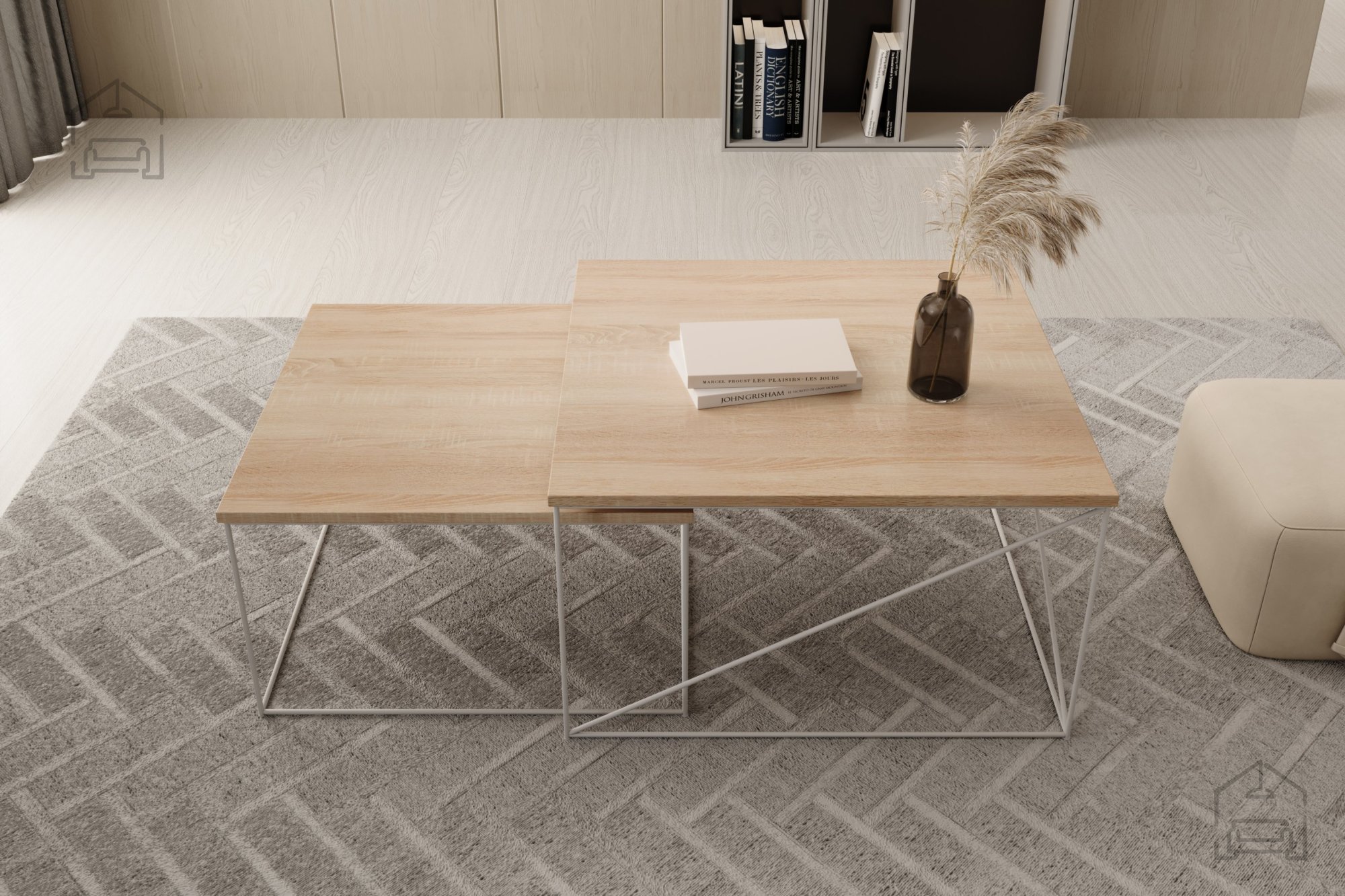 Eine elegante und zugleich praktische Lösung für das moderne Zuhause – das Set aus zwei Couchtischen in Weiß und Sonoma-Eiche vereint zeitloses Design mit funktionalem Nutzen, auf den man im Wohnzimmer einfach nicht verzichten möchte. Es ist für Menschen gedacht, die Wert auf Zweckmäßigkeit legen und gleichzeitig ein behagliches, stilvolles Ambiente schaffen möchten. Klare Linien, helle Farbtöne und sorgfältige Verarbeitung sorgen dafür, dass sich die Tische sowohl in moderne als auch in klassische Einrichtungen harmonisch einfügen.