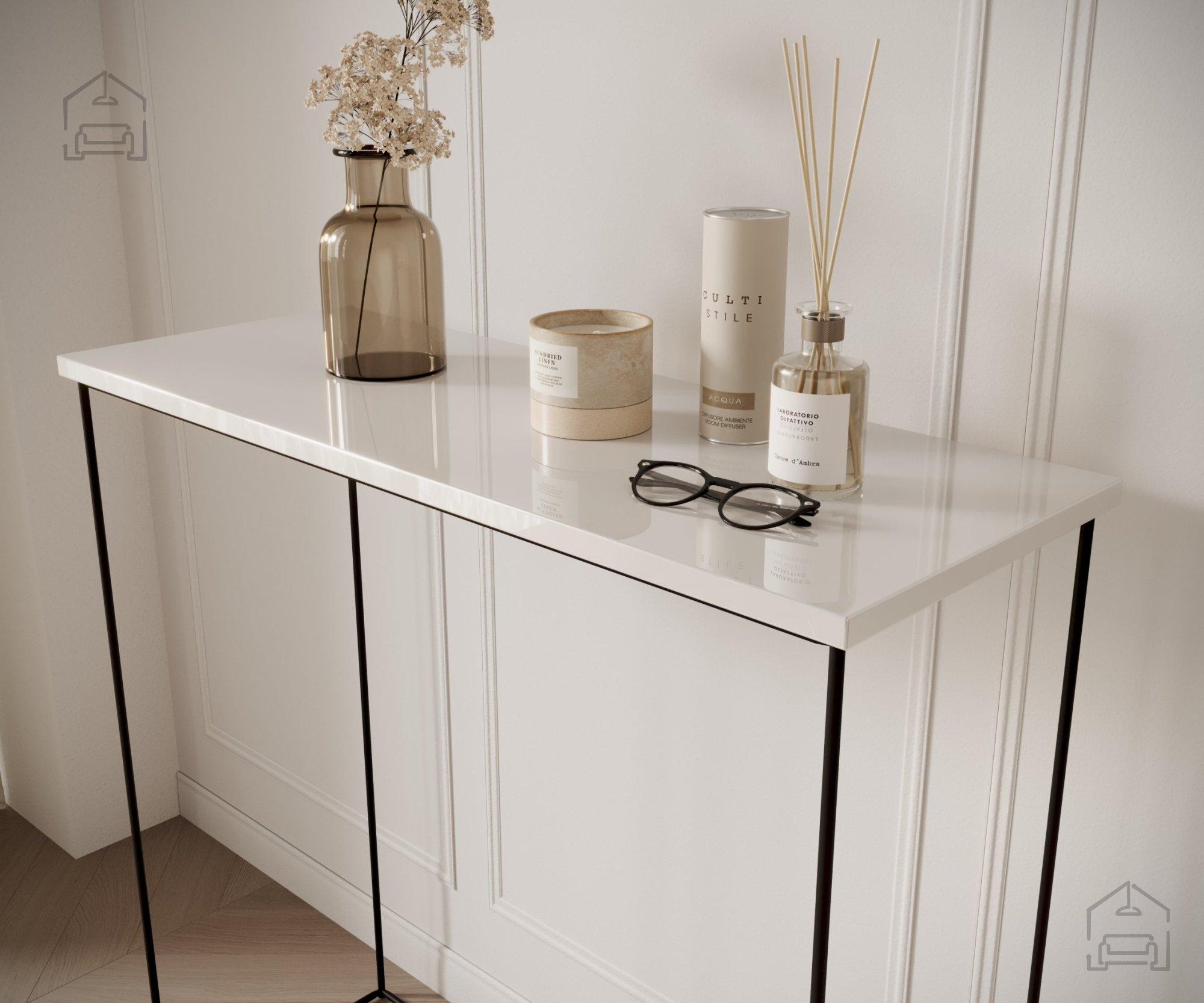 Wenn Sie Ihrem Zuhause mehr Helligkeit und optische Ausgewogenheit verleihen möchten, ist die Kombination aus weißer Hochglanzoberfläche und eleganten schwarzen Akzenten genau richtig. Dieser Kontrast sorgt für einen modernen, dynamischen Look, der dennoch zeitlos und stilvoll bleibt. Dank des universellen Designs passt der Konsolentisch sowohl zu minimalistischen als auch zu klassisch eingerichteten Räumen.
