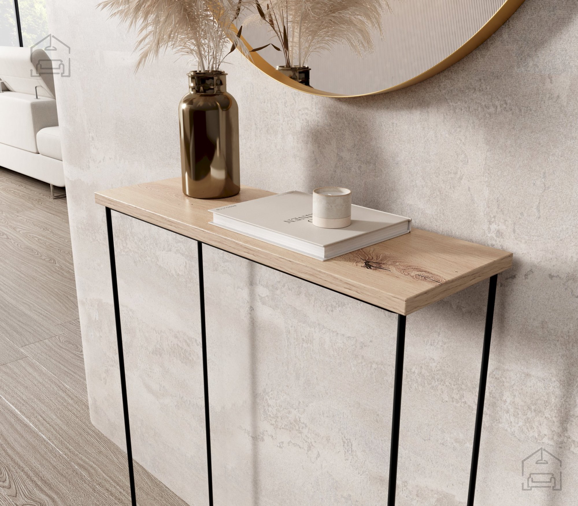 Der Konsolentisch ist so gestaltet, dass er sich harmonisch in verschiedene Einrichtungsstile einfügt – ob modern, industriell, klassisch oder skandinavisch. Durch seine schmale Form passt er perfekt an die Wand, in den Flur, das Wohnzimmer oder sogar ins Schlafzimmer, wo er als stilvolles Nachtmöbel dienen kann. Die Kombination aus Schwarz und dem Holzdekor Artisan sorgt für ein ausgewogenes Erscheinungsbild, das dem Raum Charakter und visuelle Spannung verleiht.