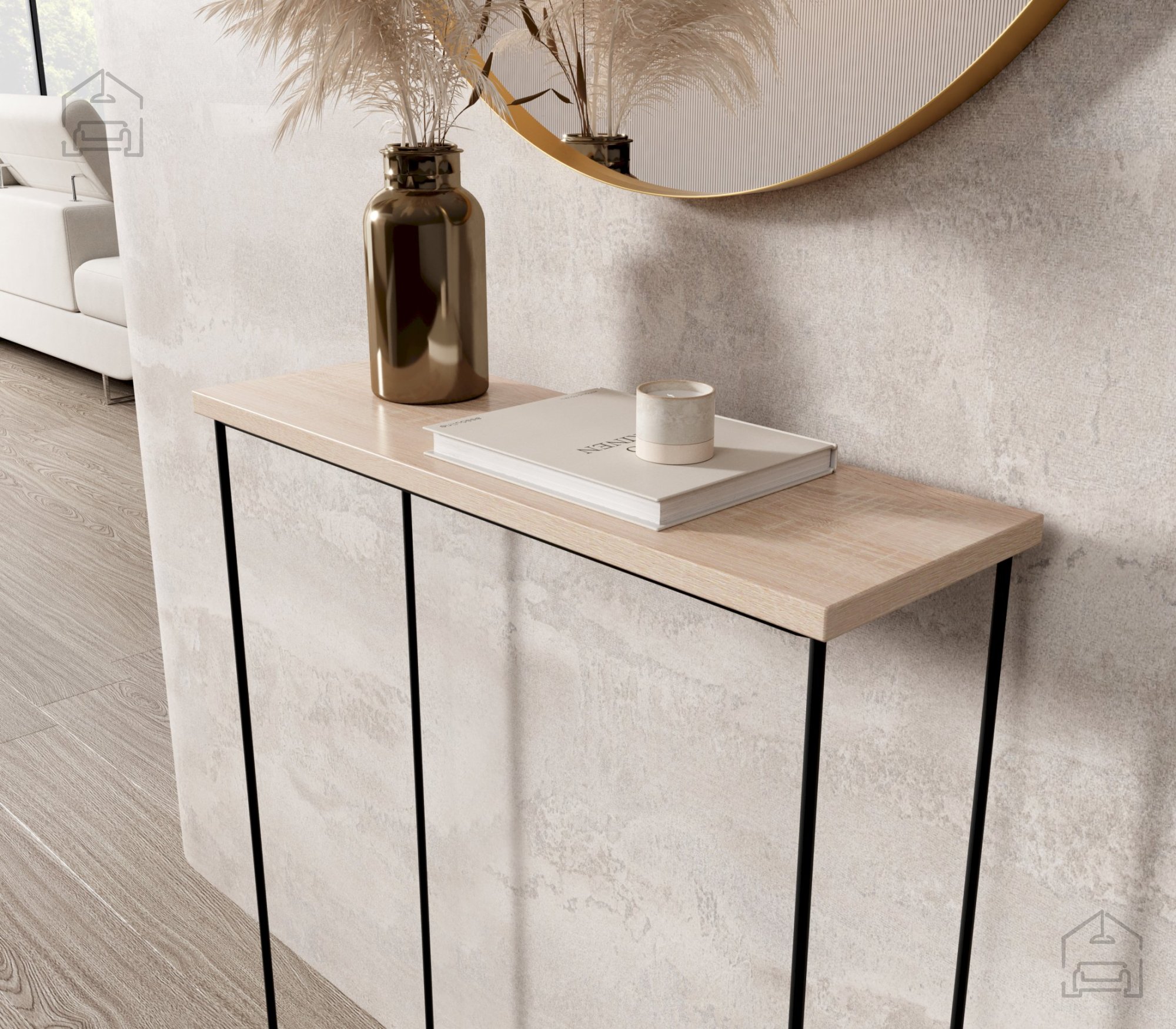 Durch die schmale, aber praktische Form eignet sich der Tisch ideal für den Flur als Ablage für Schlüssel, Post oder dekorative Accessoires. Auch im Wohnzimmer kommt er bestens zur Geltung – etwa als Platz für Blumenarrangements, Bücher oder Kunstobjekte, die Ihren persönlichen Stil betonen. Im Schlafzimmer wiederum fügt er sich als dezentes, aber stilvolles Möbelstück ein, das dem Raum Leichtigkeit und Funktionalität verleiht.