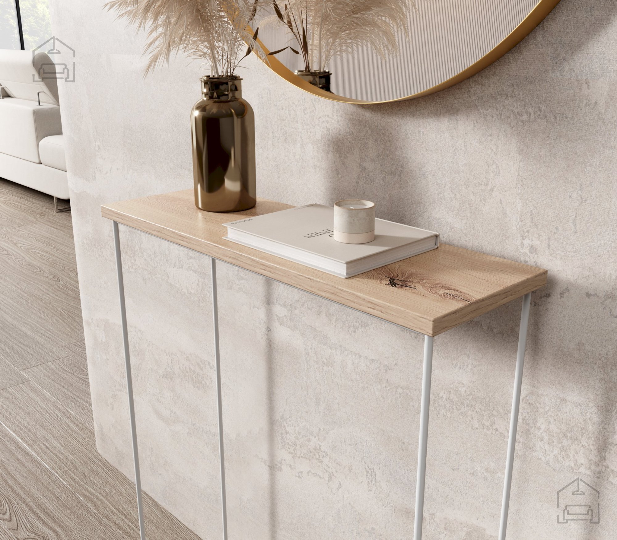 Der Konsolentisch eignet sich ideal für den Vorraum, wo Sie Schlüssel, Handy oder dekorative Accessoires ablegen können, die Ihren Eingangsbereich verschönern. Auch im Wohnzimmer macht er sich hervorragend – etwa als Platz für Blumen, Bücher oder kleine Dekorationen, die eine gemütliche Atmosphäre schaffen. Mit einer Tiefe von nur 20 cm nimmt er kaum Platz ein und ist daher auch perfekt für schmale Flure oder kleinere Zimmer geeignet. Im Schlafzimmer kann er zudem als stilvolle Schmink- oder Ablagefläche entlang der Wand dienen.