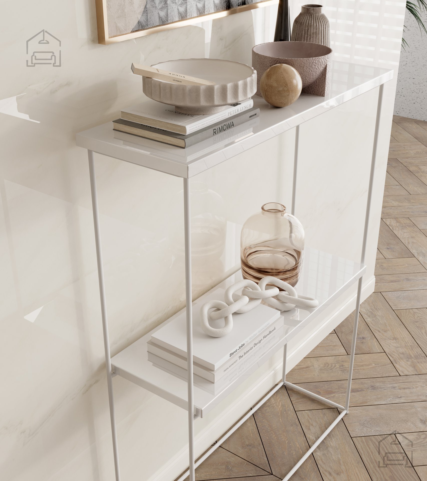 Bringen Sie frischen Schwung in Ihr Zuhause mit einem Möbelstück, das modernes Design und praktische Funktionalität vereint. Der Konsolentisch in Weiß und Hochglanz-Weiß ist die ideale Wahl für alle, die minimalistisches Design, klare Linien und hochwertige Materialien schätzen. Dank seiner kompakten Form und den Maßen 60x20x80 cm passt er auch perfekt in kleinere Räume und bietet gleichzeitig eine praktische Ablagefläche für Alltagsgegenstände oder dekorative Accessoires.