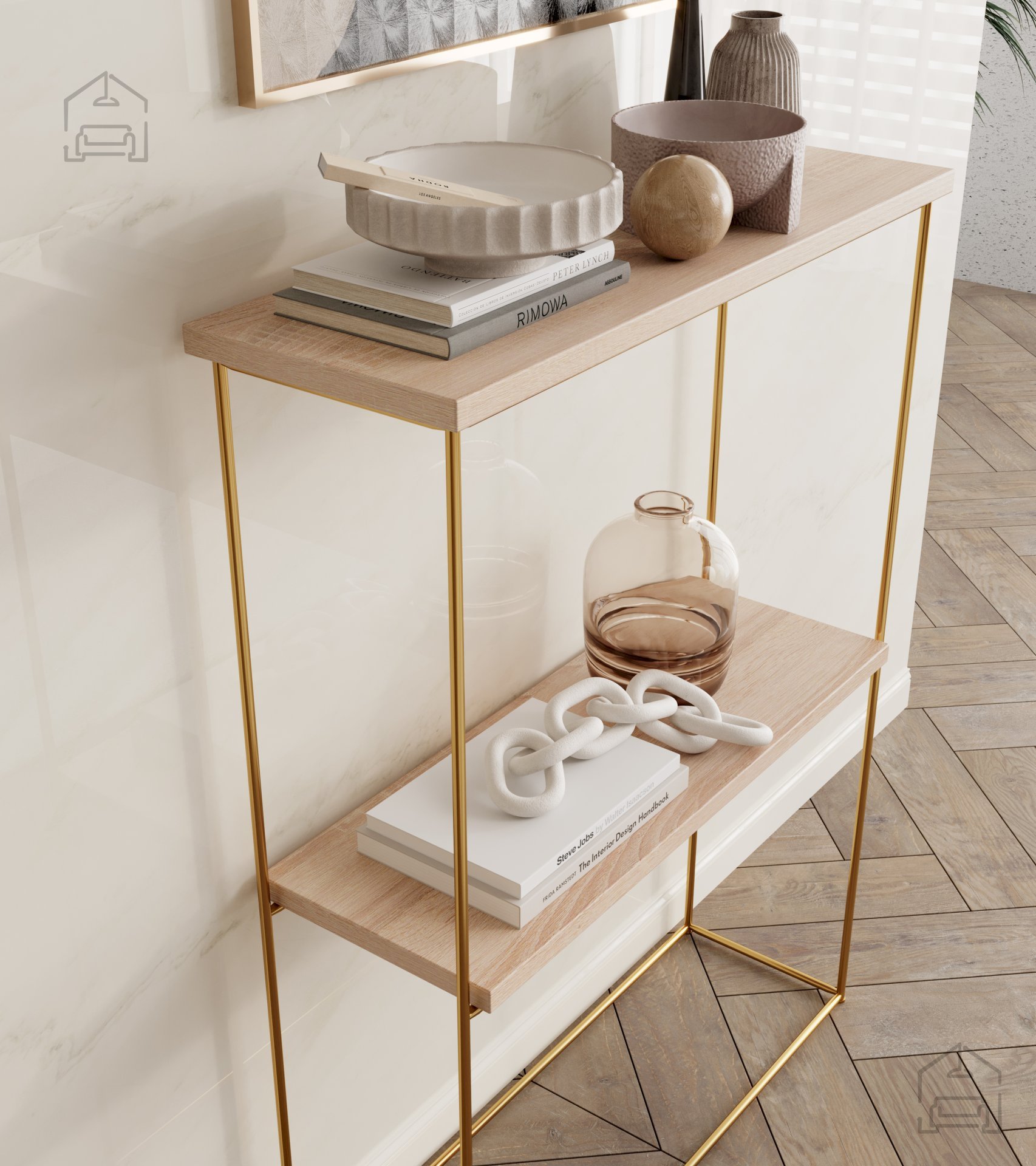 Neben seinem ansprechenden Design überzeugt der Konsolentisch auch durch Funktionalität. Zwei Ablageflächen bieten Platz für Dekorationen, Bücher, Schlüssel oder andere Alltagsgegenstände. Dank seiner kompakten Form ist er ideal für kleinere Räume, in denen Ästhetik und Nutzen gleichermaßen wichtig sind. Sie können ihn an die Wand stellen, hinter das Sofa oder neben die Eingangstür – so schaffen Sie eine praktische und stilvolle Ablagefläche.