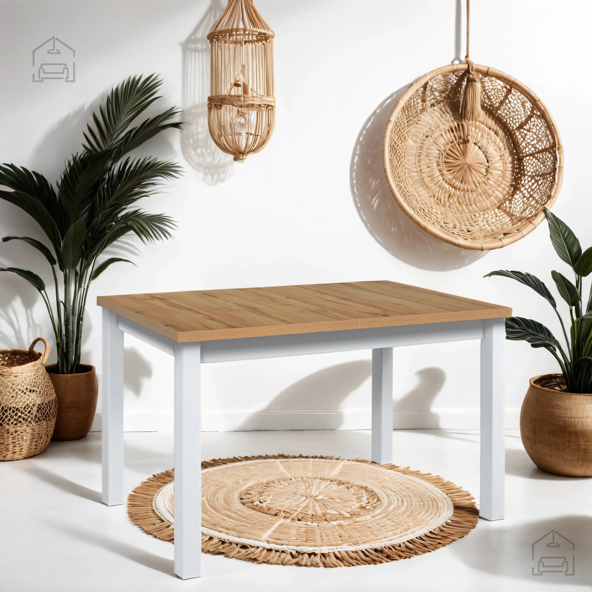 Die Farbkombination Weiß/Wotan wirkt modern und zugleich gemütlich. Die weiße Oberfläche hellt den Raum optisch auf, während der Wotan-Eichenfarbton Wärme und Natürlichkeit vermittelt. Diese Kombination lässt sich mühelos mit unterschiedlichen Einrichtungsstilen kombinieren – von skandinavischer Schlichtheit über modernes Minimaldesign bis hin zu rustikalem oder ländlichem Ambiente. Die Tischplatte ist mit einer schützenden Laminatschicht versehen, die vor Kratzern, Flecken und Feuchtigkeit schützt, sodass der Tisch über viele Jahre hinweg seinen frischen Look behält.
