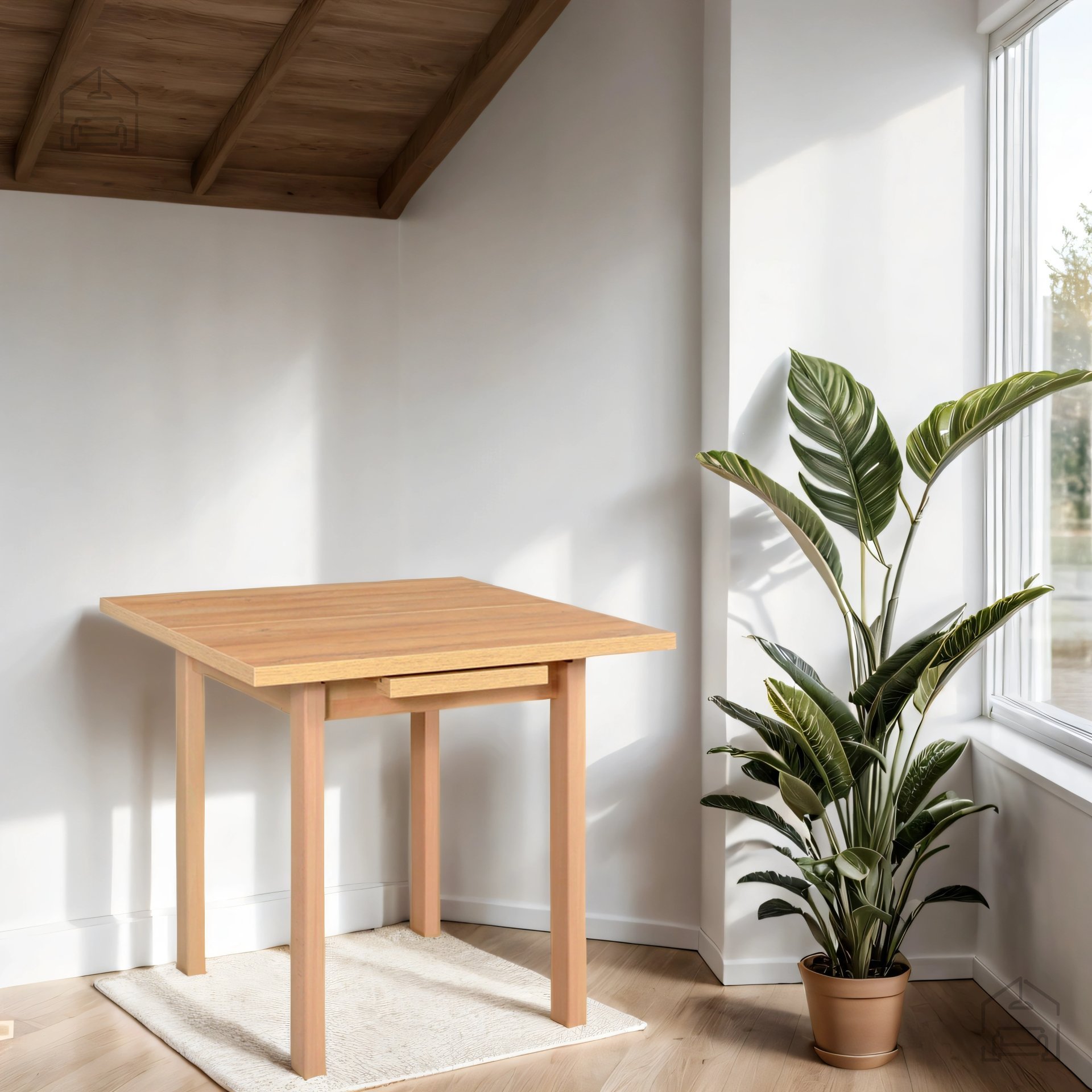 Die Grundmaße des Tisches betragen 80 cm in der Breite, ebenso 80 cm in der Tiefe und 76 cm in der Höhe. Diese Dimensionen bieten bequem Platz für vier Personen im nicht ausgezogenen Zustand, während in der erweiterten Version bis zu sechs Personen Platz finden. Dank seiner kompakten Form beansprucht der Tisch nur wenig Raum, bietet aber dennoch ausreichend Fläche für den Alltag – vom Frühstück über das Mittagessen bis hin zu gemütlichen Kaffee- oder Abendrunden.