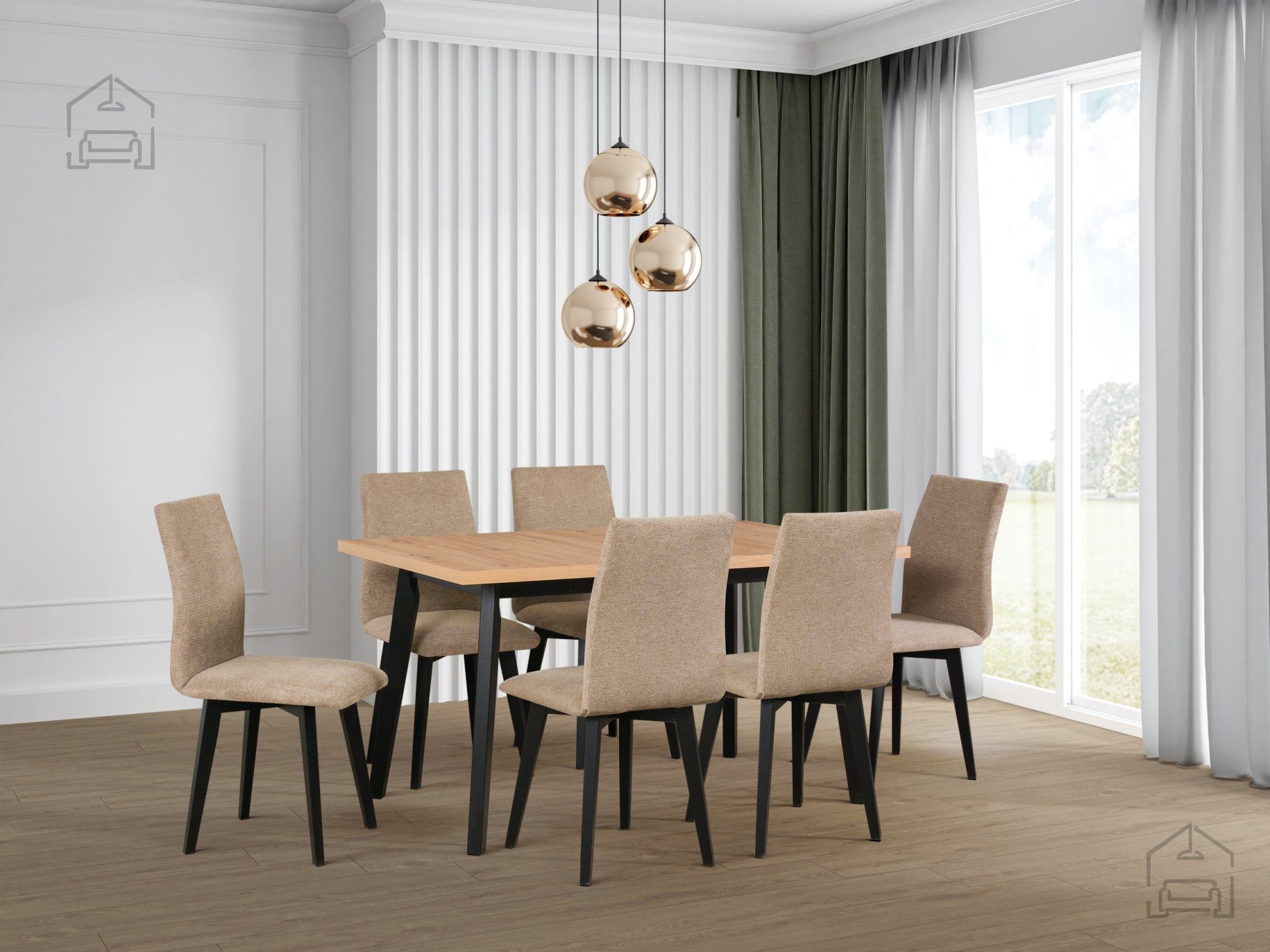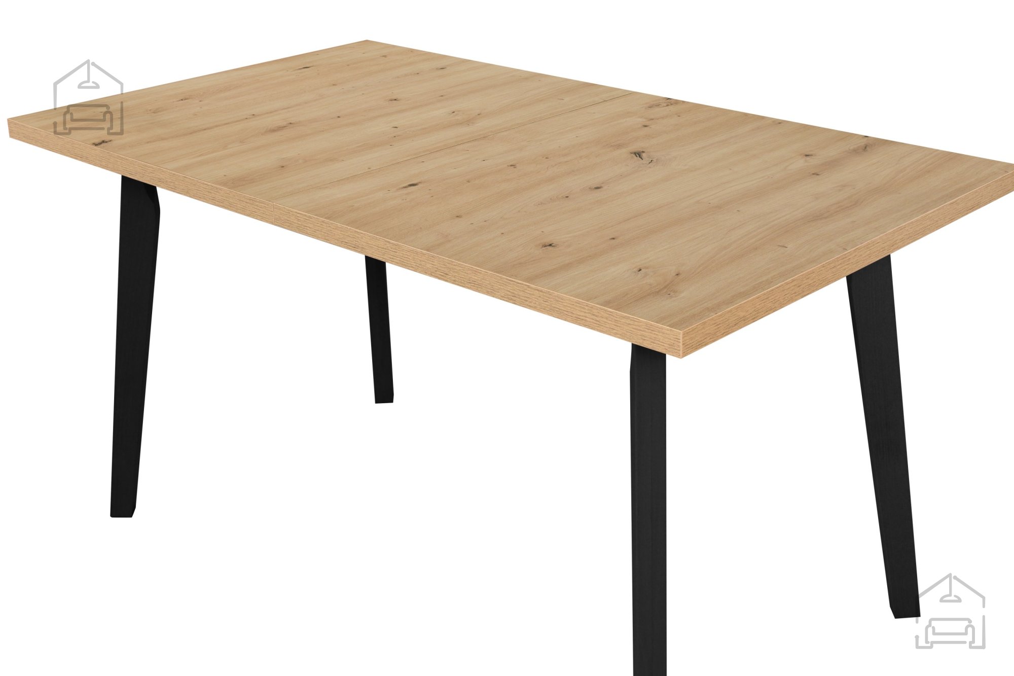 Gefertigt ist der Tisch aus massiver Buche, die für ihre Robustheit, Langlebigkeit und warme, natürliche Optik bekannt ist. Die Tischplatte ist zusätzlich mit einer laminierten Beschichtung versehen, wodurch sie unempfindlicher gegen Kratzer, Flecken und Hitze ist und sich besonders leicht reinigen lässt. Die Kombination aus echtem Holz und Laminat sorgt für eine lange Lebensdauer und ein gepflegtes Erscheinungsbild, selbst bei täglicher Nutzung. Die Farbgestaltung in Schwarz/Artisan verleiht dem Tisch eine moderne Note – schwarze Tischbeine betonen die Eleganz, während der warme Artisan-Holzton eine gemütliche Atmosphäre schafft.