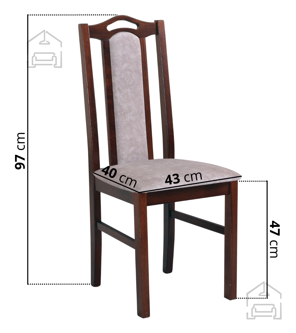 Für die Herstellung des Stuhls Bos 9 verwenden die Fachleute von Drewmix massives Buchenholz, das für seine Festigkeit und Widerstandsfähigkeit bekannt ist. Buche lässt sich präzise verarbeiten, wodurch die Kanten schön abgerundet und die Oberfläche besonders glatt ist. Die Lackierung hebt die natürliche Struktur des Holzes hervor und schützt sie vor Staub, Feuchtigkeit und täglicher Beanspruchung. Die gepolsterte Sitzfläche aus strapazierfähigem Stoff ist in mehreren Farbvarianten erhältlich – von warmem Nussbaum, Sonoma, Erle und Kastanie bis hin zum modernen Wenge-Ton. Diese Auswahl ermöglicht es, den Stuhl Bos 9 harmonisch mit unterschiedlichen Esstischen und Einrichtungsstilen – ob klassisch, skandinavisch oder rustikal – zu kombinieren.