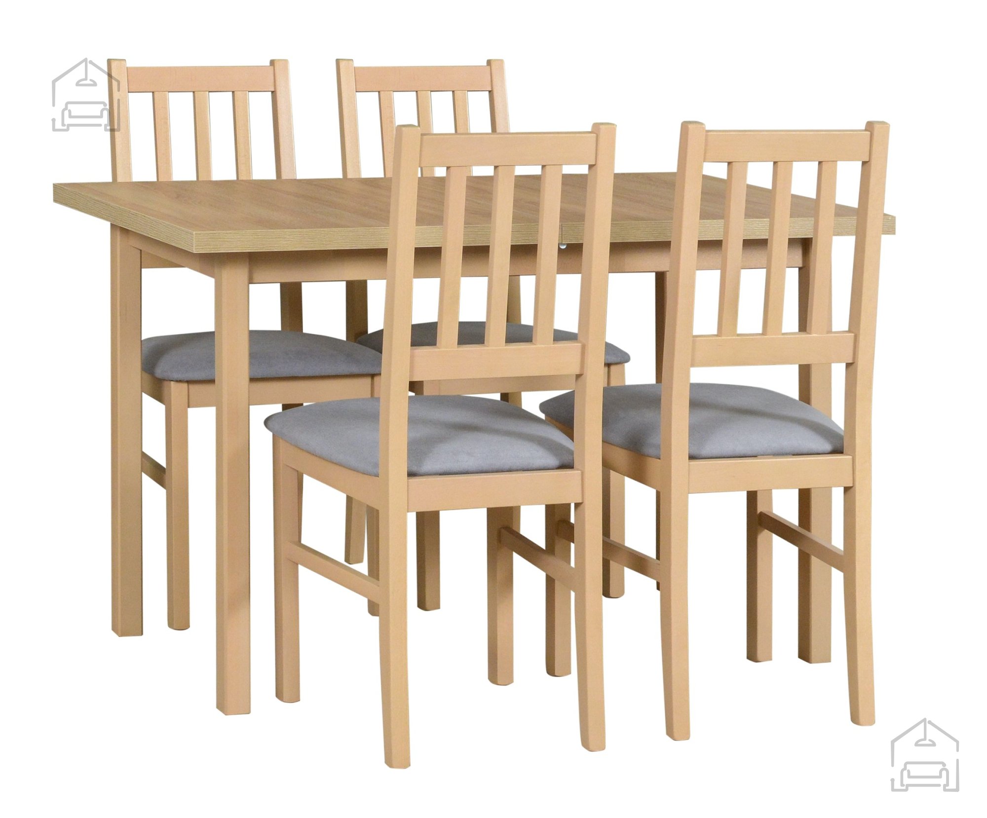 Für dieses Set wurden ausschließlich ausgewählte Materialien verwendet. Der Tisch besteht aus massivem Buchenholz, das für seine Härte und Widerstandsfähigkeit gegenüber mechanischen Einflüssen bekannt ist. Die Oberfläche ist mit einer hitze- und fleckenbeständigen Laminatplatte geschützt, was die Pflege im Alltag besonders einfach macht. Auch die Stühle Bos 4 Sonoma 1B sind aus Buche gefertigt und farblich perfekt auf den Tisch abgestimmt – so entsteht ein harmonisches Gesamtbild. Die klaren Linien der Rückenlehne und die bequeme Sitzfläche ermöglichen ein angenehmes Sitzen auch über längere Zeit.