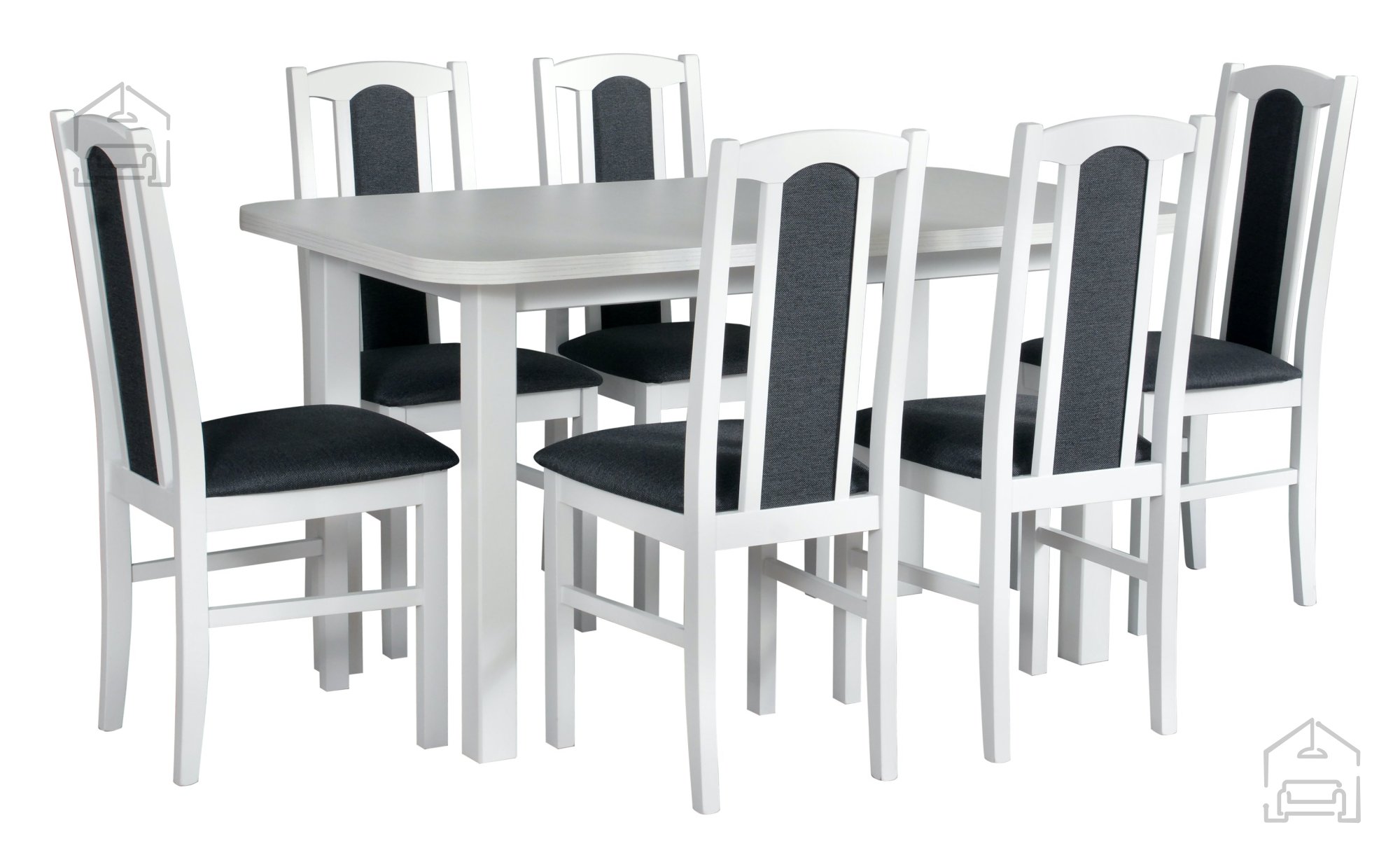 Zum Set gehören sechs bequeme Stühle, die ergonomisch und stabil gestaltet sind. Ihre Höhe und Rückenlehne bieten eine gute Unterstützung für den Rücken, sodass Sie auch bei längeren Mahlzeiten angenehm sitzen. Die Stühle sind ebenfalls aus strapazierfähigem Buchenholz gefertigt, und ihre weiße Farbe harmoniert perfekt mit dem Tisch – für ein stimmiges Gesamtbild.