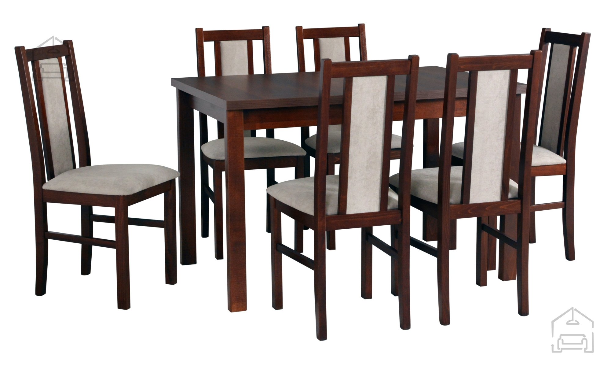Ausziehbarer Tisch 80×120–150×76 cm aus massivem Buchenholz: Esszimmer-Set Tisch Alba 2 Nussbaum + 6 Stühle Bos 14 Nussbaum 3B – Drewmix.