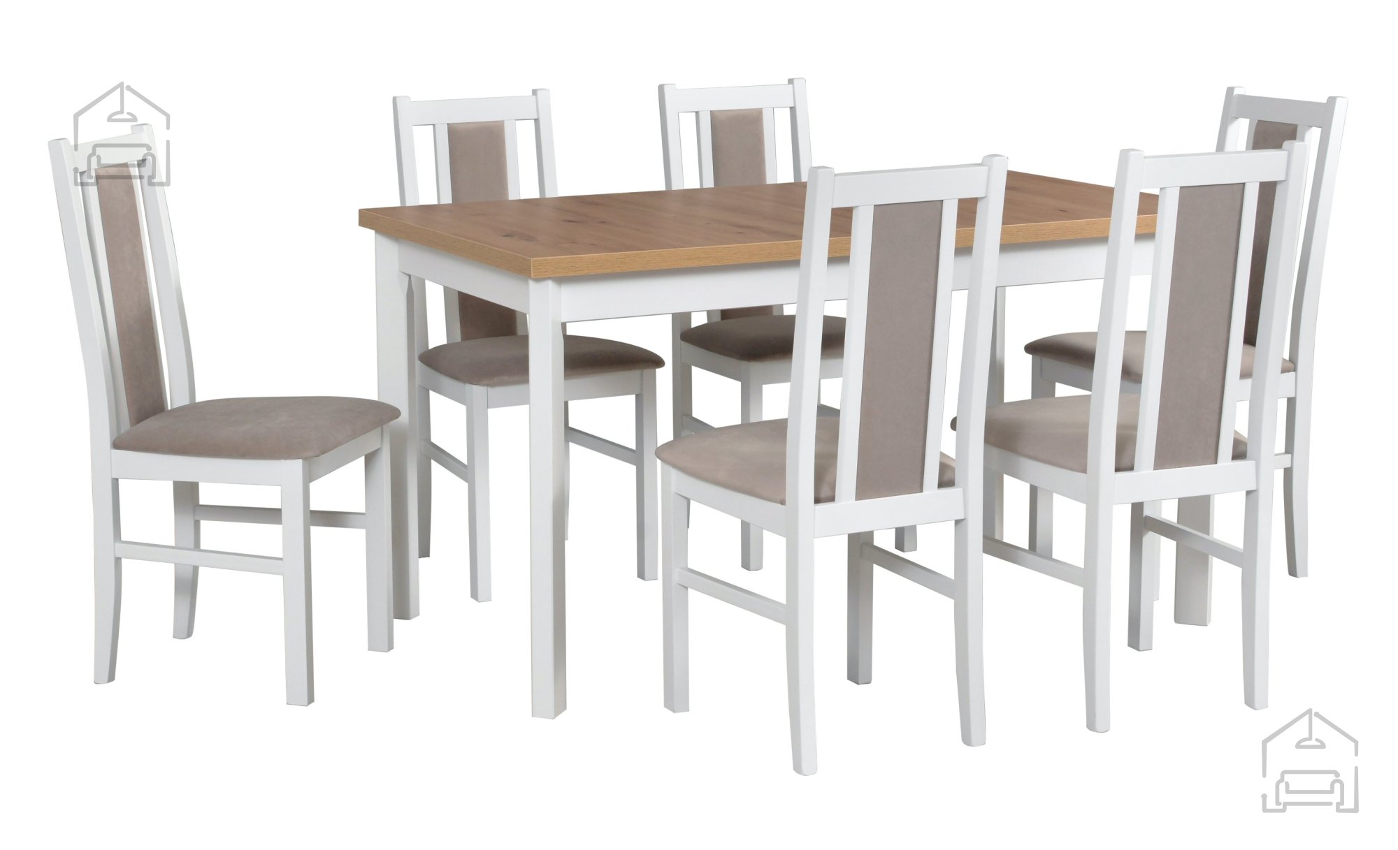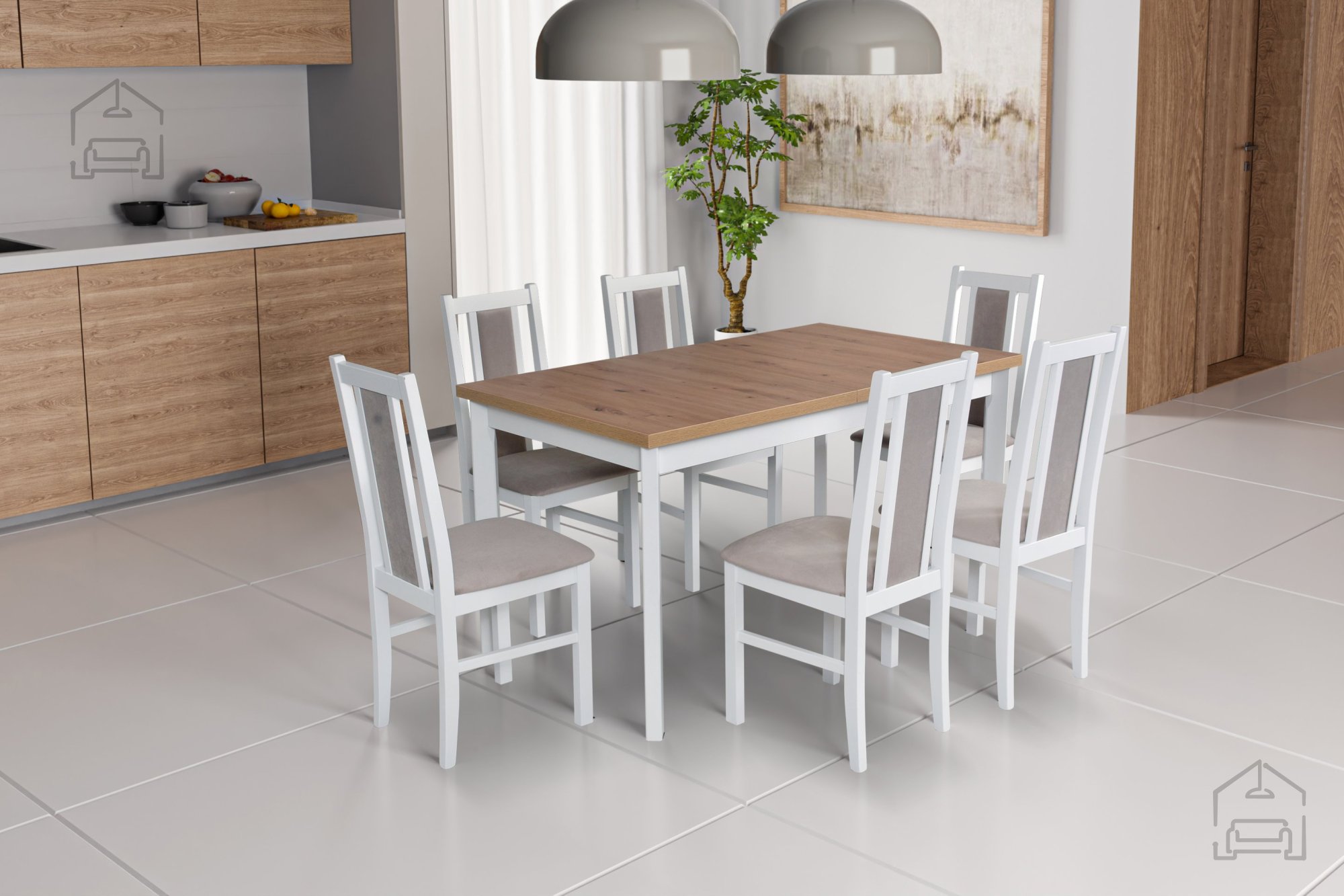 Ausziehbarer Esstisch 140–180 cm aus massiver Buche: Esszimmer-Set Tisch Modena 1P Weiß/Artisan + 6 Stühle Bos 14 Weiß 27B – Drewmix.